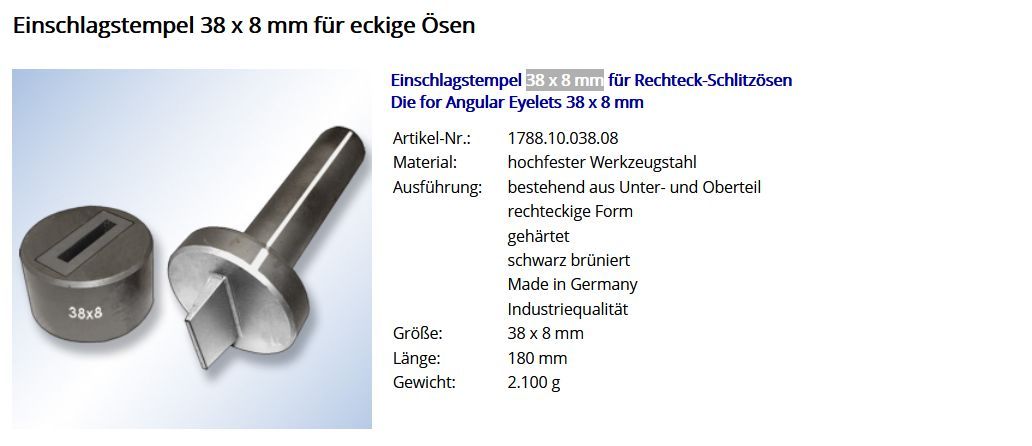 Einschlagstempel 38 x 8 mm für Rechteck-Schlitzöse Einsetzwerkzeug PVC Plane Neu