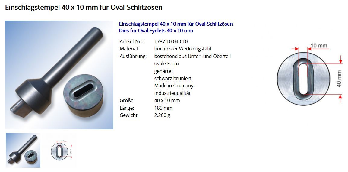 Einschlagstempel für Oval-Schlitzösen 40 x 10 mm Dies für Oval Eyelets Artikel-Nr.: 1787.10.040.10 Material: hochfester Werkzeugstahl Ausführung: bestehend aus Unter- und Oberteil ovale Form gehärtet schwarz brüniert Made in Germany Industriequalität Größe: 40 x 10 mm Länge: 185 mm Gewicht 2.200 kg