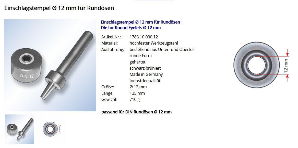 Einschlagstempel für Rundösen Durchschitt 12 mm Dies for Round Eyelets Artikel-Nr.: 1786.10.000.12 Material: hochfester Werkzeugstahl Ausführung: bestehend aus Unter- und Oberteil runde Form gehärtet schwarz brüniert Made in Germany Industriequalität Größe: Durchschitt 12 mm Länge: 135 mm Gewicht 71