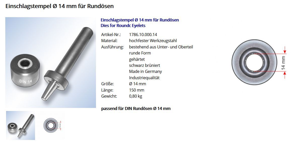 Einschlagstempel für Rundösen Durchschitt 14 mm Dies for Round Eyelets Artikel-Nr.: 1786.10.000.14 Material: hochfester Werkzeugstahl Ausführung: bestehend aus Unter- und Oberteil runde Form gehärtet schwarz brüniert Made in Germany Industriequalität Größe: Durchschitt 14 mm Länge: 150 mm Gewicht 80
