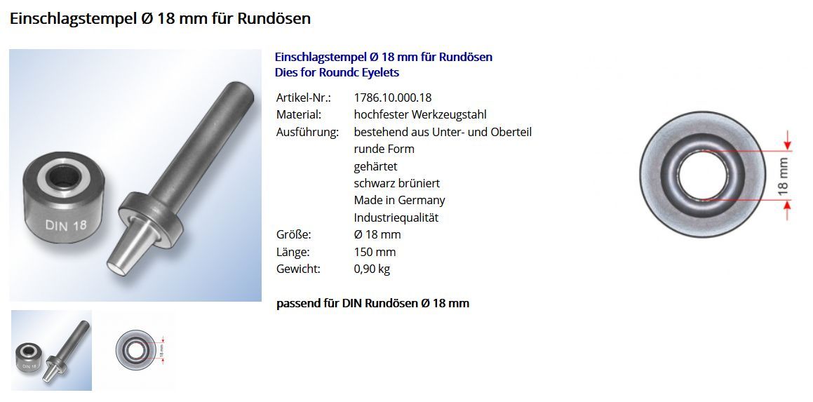 Einschlagstempel für Rundösen Durchschitt 25 mm Dies for Round Eyelets Artikel-Nr.: 1786.10.000.25 Material: hochfester Werkzeugstahl Ausführung: bestehend aus Unter- und Oberteil runde Form gehärtet schwarz brüniert Made in Germany Industriequalität Größe: Durchschitt 25 mm Länge: 150 mm Gewicht 1,