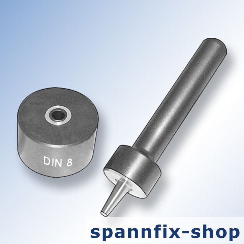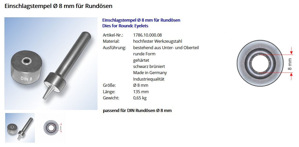 E inschlagstempel für Rundösen Durchschitt 8 mm Dies for Round Eyelets Artikel-Nr.: 1786.10.000.08 Material: hochfester Werkzeugstahl Ausführung: bestehend aus Unter- und Oberteil runde Form gehärtet schwarz brüniert Made in Germany Industriequalität Größe: Durchschitt 8 mm Länge: 135 mm Gewicht 650