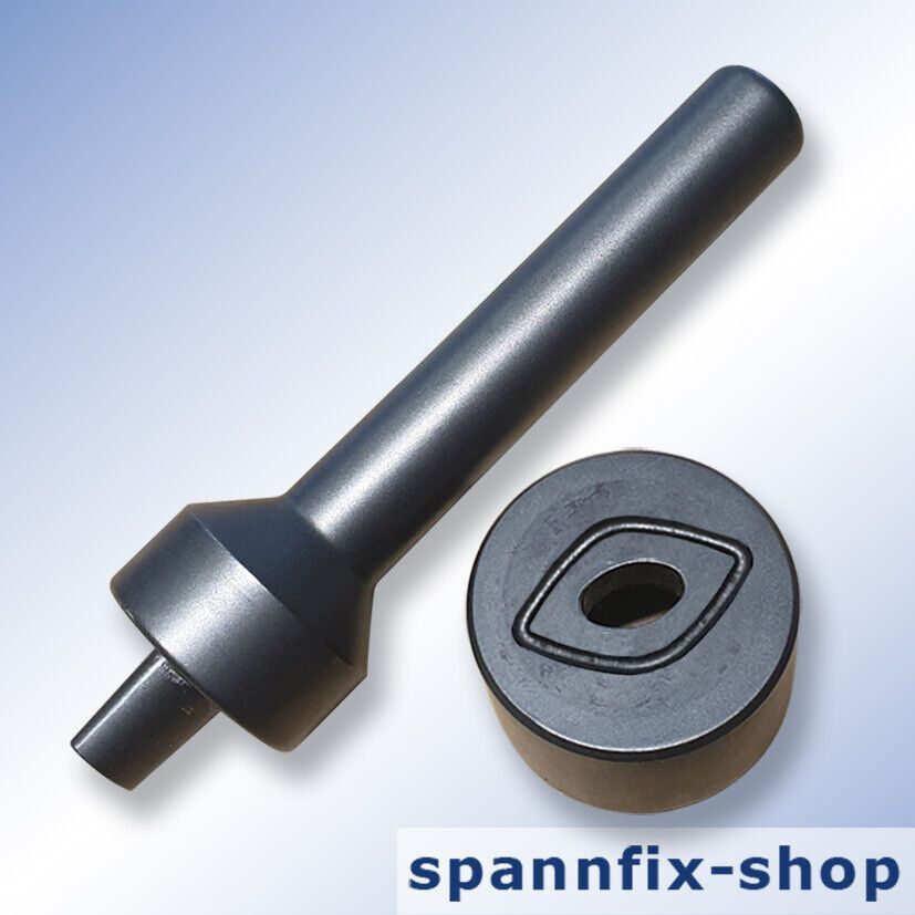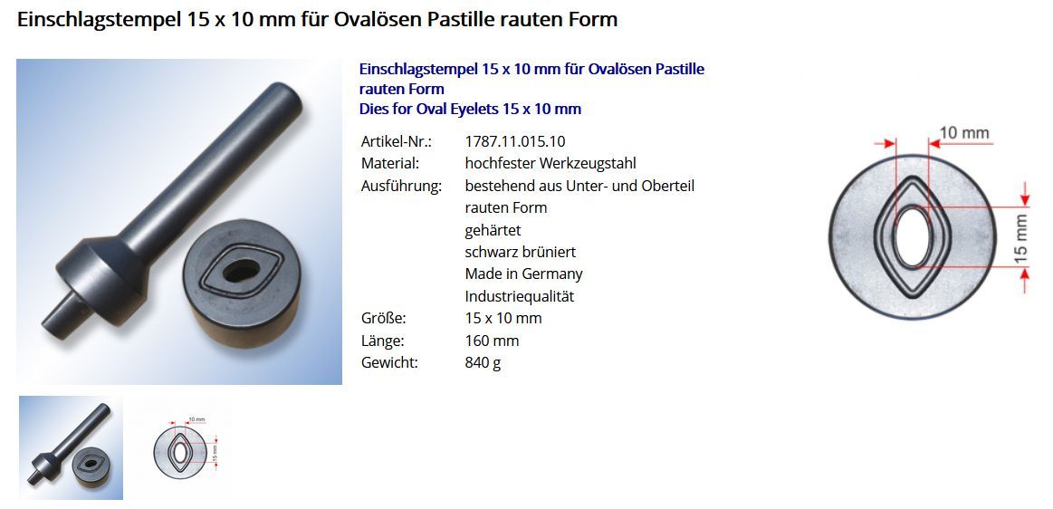 Einschlagstempel für Ovalösen 15 x 10 mm Dies für Oval Eyelets Artikel-Nr.: 1787.11.015.10 Material: hochfester Werkzeugstahl Ausführung: bestehend aus Unter- und Oberteil rauten Form gehärtet schwarz brüniert Made in Germany Industriequalität Größe: 15 x 10 mm Länge: 160 mm Gewicht 840 kg Artikel-N
