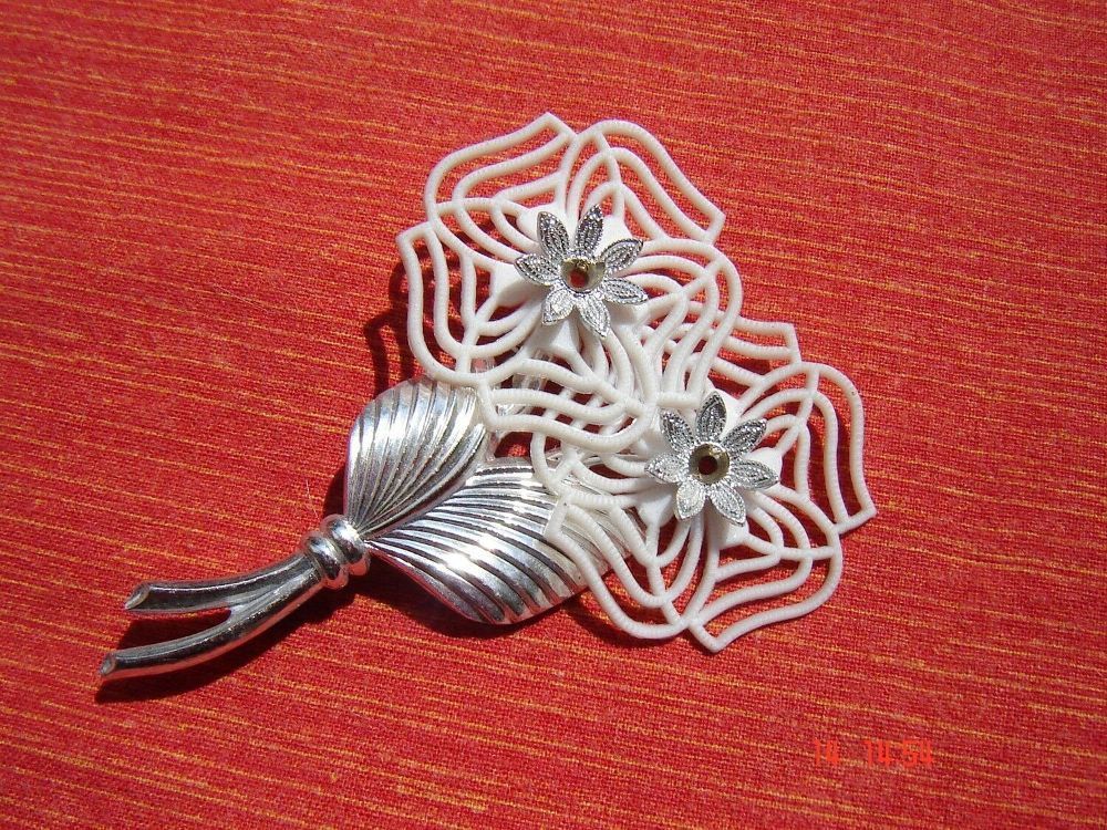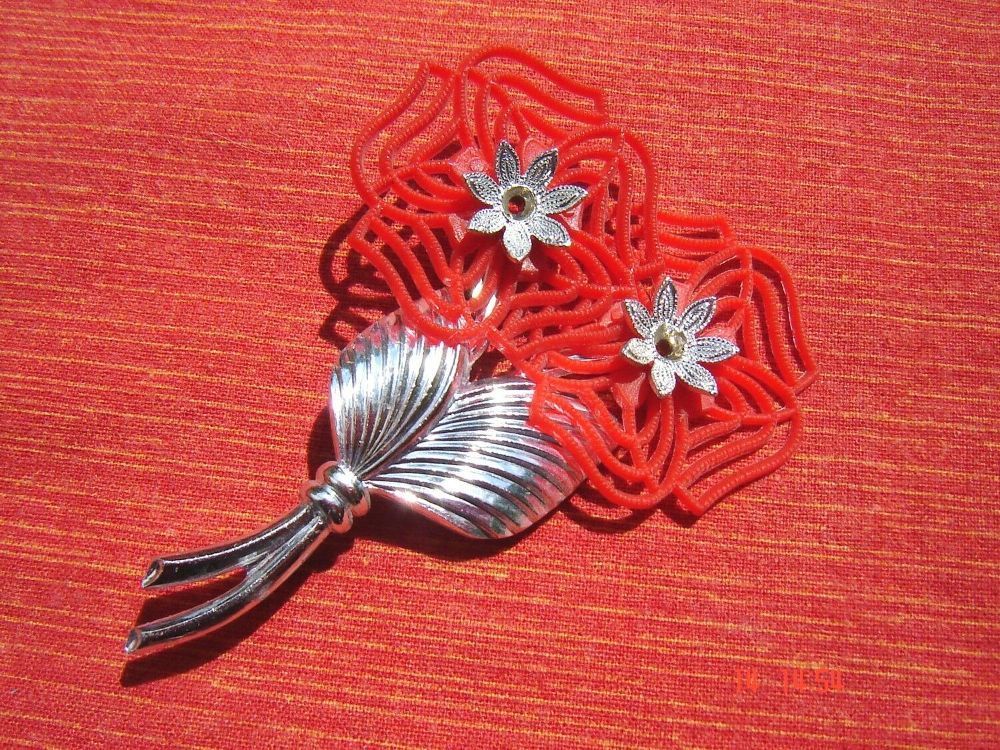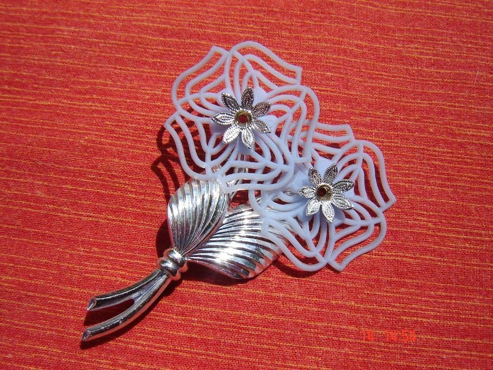 Einzelstück Art Deco Vintage Brosche hellsilberfarben mit 2 Blüten in 3 Farben Z p