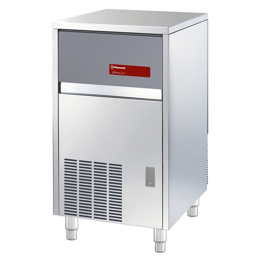 Eiswürfelbereiter mit einer Tagesleistung von 47kg, für 18 g Volleiswürfel, geeignet für Umgebungstemperaturen: +10 C / +43 C, Kühlmittel: R290, mit Vorratsbehälter: 25 kg (ca. 1470 Eiswürfel), Produktionsmenge: 47 kg (ca. 2700 Eiswürfel) / 24 h, 500 Watt, 230 V / 1 N / 50 Hz, Festwasseranschl.: 3/4 "", empf. Wasserdruck: 1 - 6 bar, Wasserabfluss: 24 mm, Wasserverbrauch: ca. 4,0 Liter / kg, Maße (BxTxH): 500 x 580 x 800/910 mm