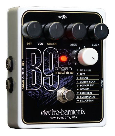 Electro Harmonix B9 Organ Machine Effekt erzeugt aus dem Instrumentensignal verschiedene Orgelsounds Dry-Instrumentensignal mischbar mit Orgelsound 9 abgestimmte Presets schnelles Tracking Regler für: Dry (Vol), Organ (Vol), Mod und Click Klinke Eingang 2 Klinke Ausgänge für Inputsignal (Dry) und Ef