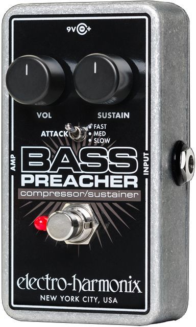 Electro Harmonix Bass Preacher Compressor Sustainer speziell für Bass Regler: Volume, Sustain 3-wege Schalter für Attack Zeit Maße in mm: 70 (w) x 115 (l) x 54 (h) Stromversorgung mit einer 9V Batterie oder einem 9V DC Netzteil
