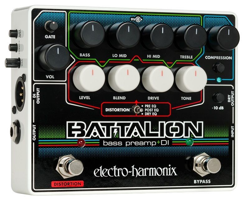 Electro Harmonix Battalion Bass Preamp und DI kompaktes und flexibles DI Pedal mit schaltbarem Distortion XLR DI-Output 6,3 mm Klinken-Ausgangsbuchse auch für Kopfhörer geeignet fest verdrahtete 6,3 mm Dry-Out-Buchse Gate, Vol, Bass, Lo Mid, Treble, Compression, Level, Blend, Drive Tone und DI Volum