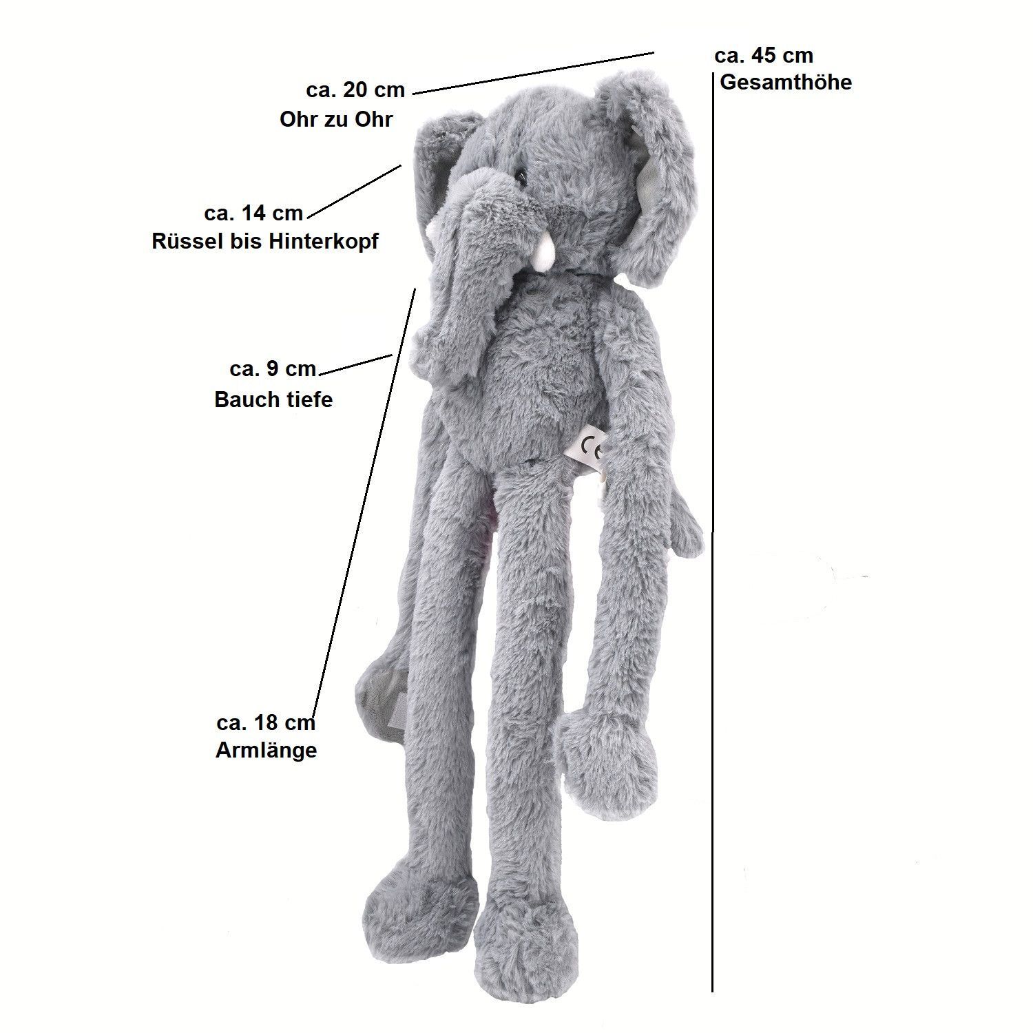 Elefant Kuscheltier 45 cm Grau Plüschtier mit Kletthänden