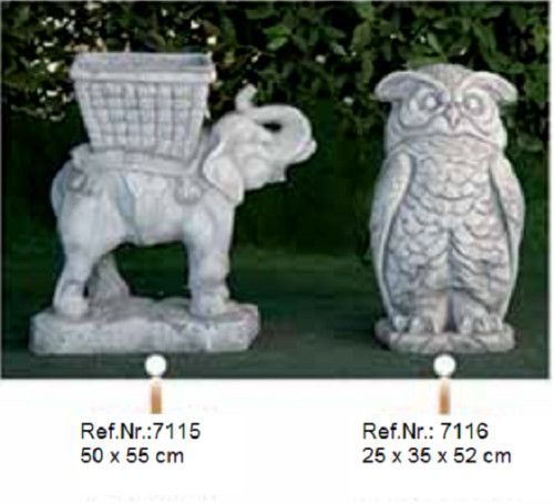 Der Elefant mit einen Pflanzkübel auf den Rücken und die Eule sind ein toller Blickfang für jeden Garten oder Terrasse. Die Skulpturen sind ein antiker Guss aus Witterung - und frostbeständigem Weißstein und in den Farben Grau, Braun oder Ocker erhältlich und werden in aufwendiger Handarbeit in Andalusien hergestellt und verleiht jedes Anwesen oder Terrasse einen mediterranen Touch.
