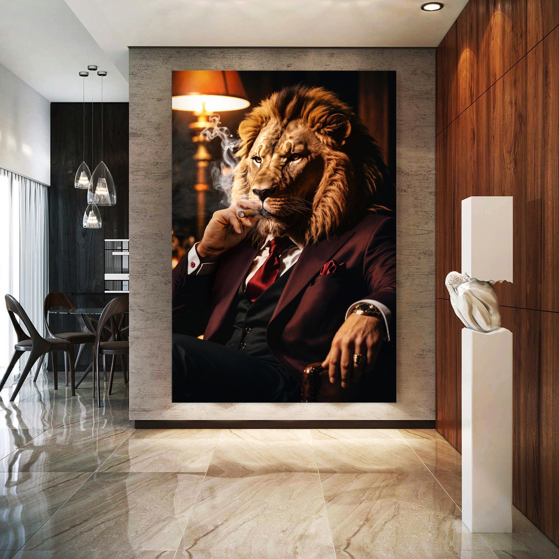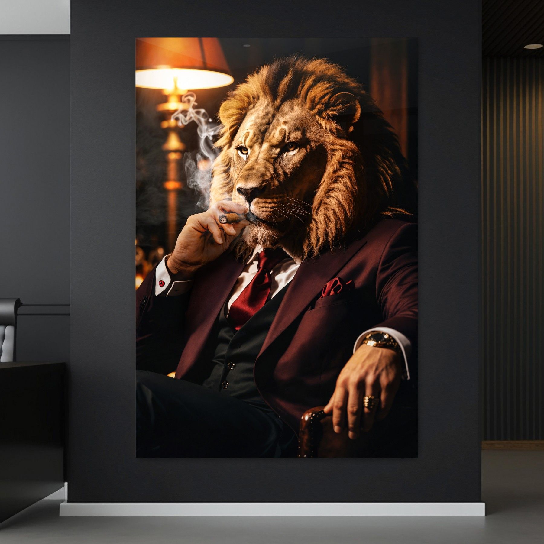 Elegant gekleideter Löwe, BOSS Tier Wandbild Leinwand, Acrylglas oder Poster