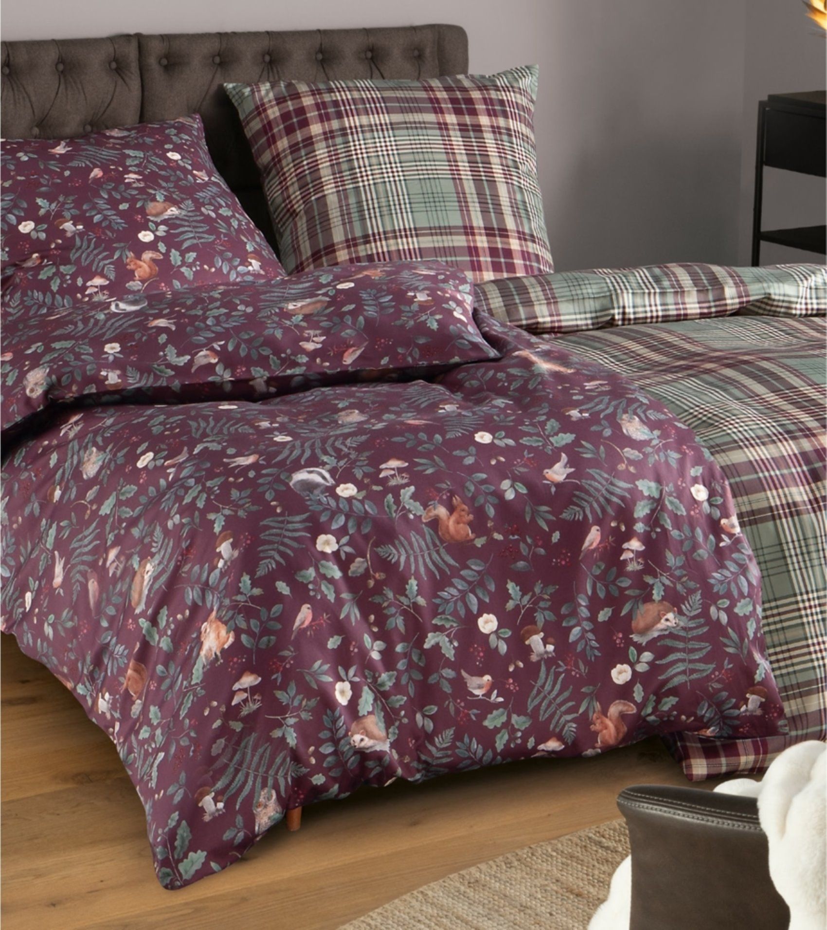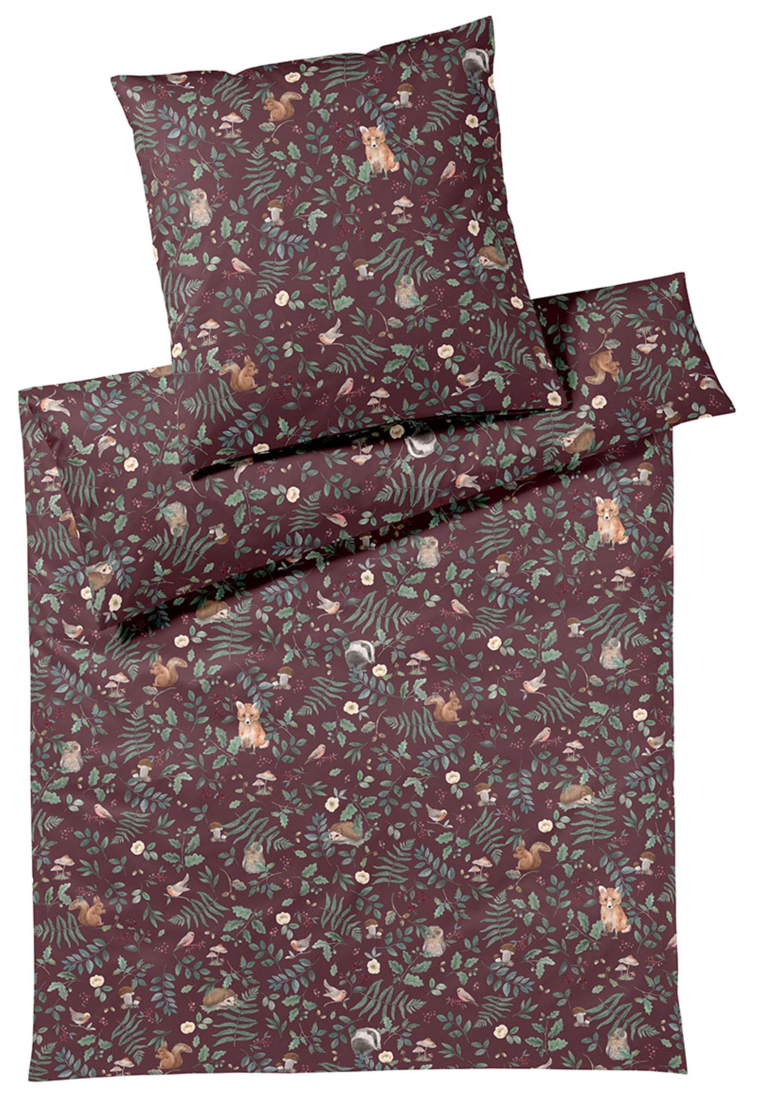 Elegante Mako Jersey Bettwäsche 135x200 Hide dunkelrot Waldtiere Fuchs Dachs Vögel