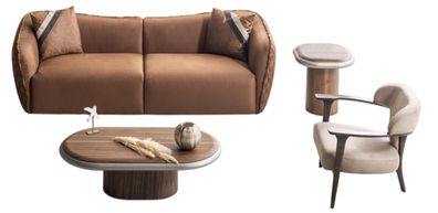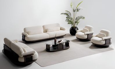 Designer Wohnzimmer Garnitur Polstercouch Textilsessel Holztisch