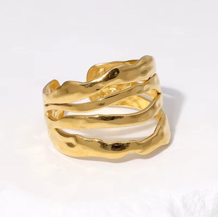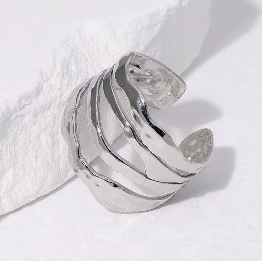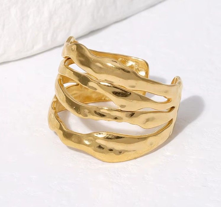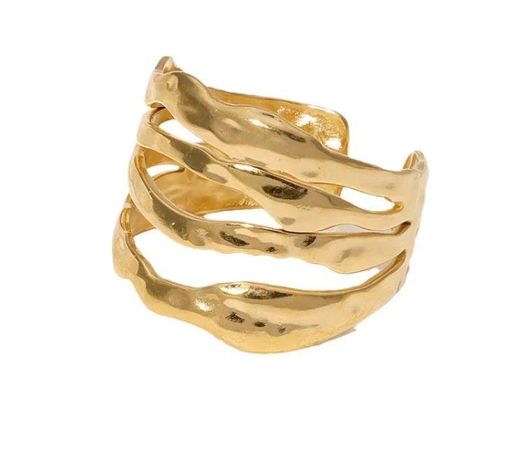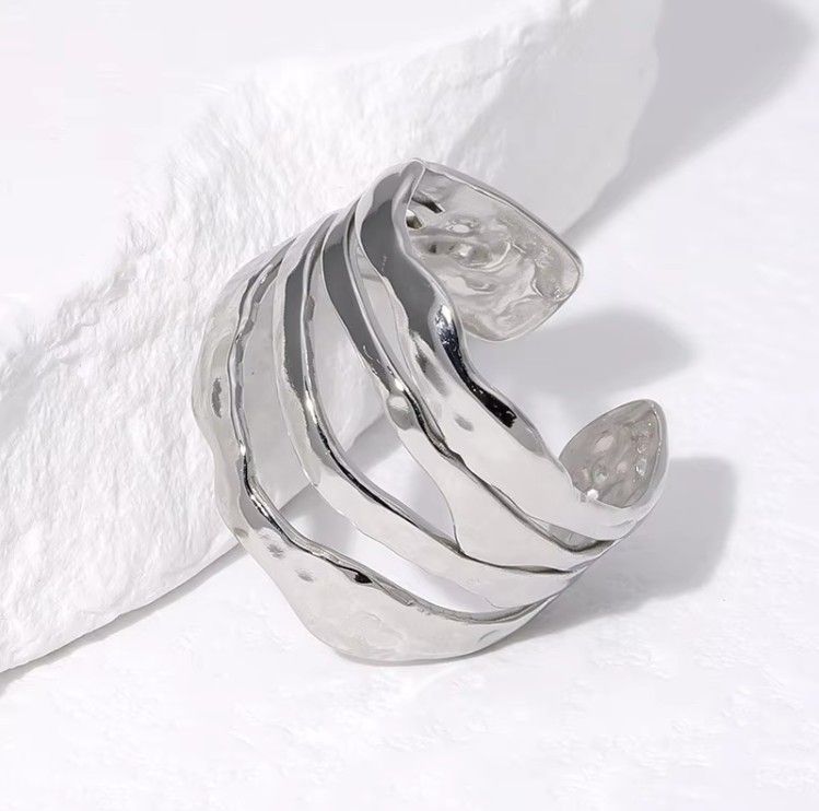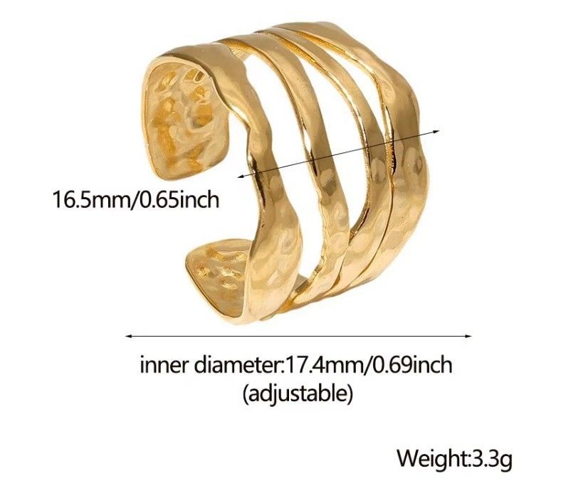 Eleganter Boho Statement-Ring für Damen – Mehrschichtig, Gehämmert, Verstellbar, Edelstahl, 18 Karat Vergoldet Silber-Finish Produktbeschreibung für den internen Verkauf Hauptmerkmale Design & Stil: Dieser einzigartige Ring kombiniert ein klobiges, mehrschichtiges Design mit einem eleganten Boho-Sti