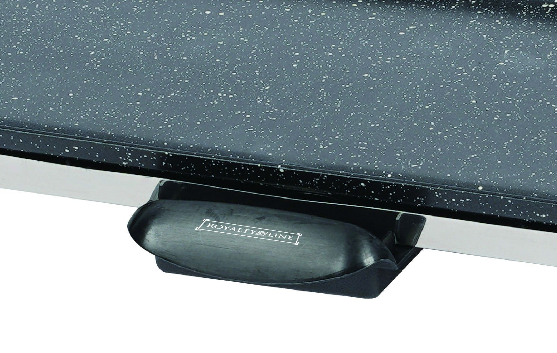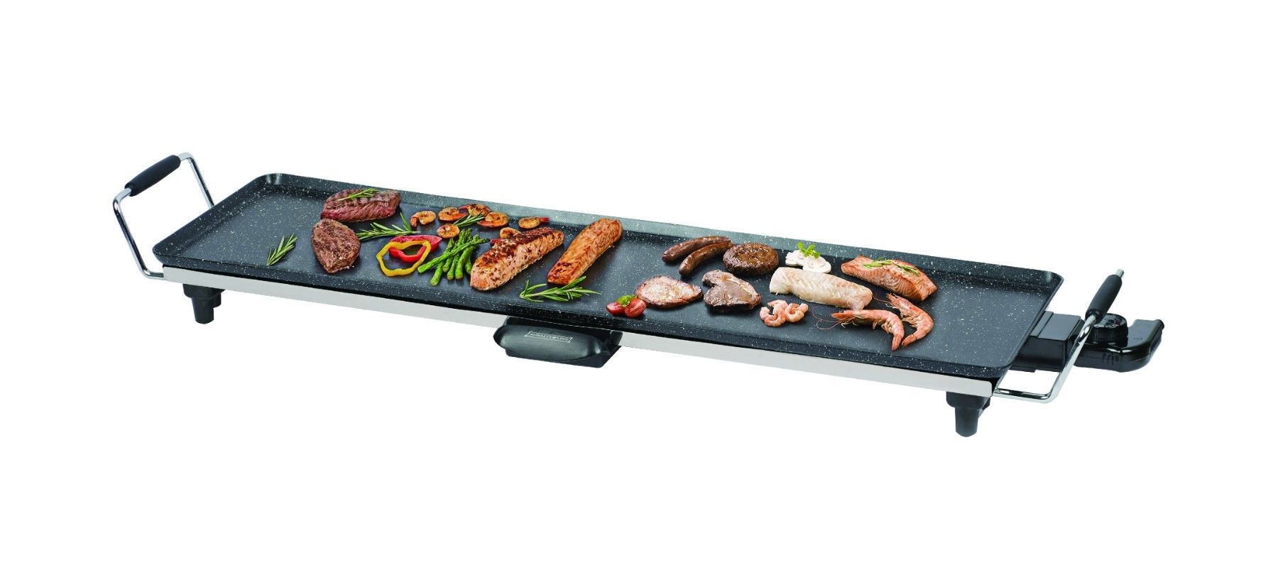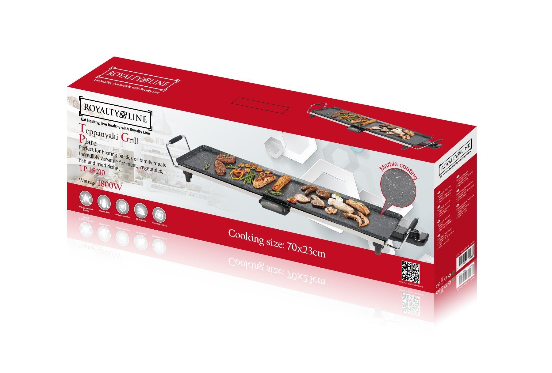 Royalty Line Teppanyaki-Tischgrill: 1800 W, 70 × 23 cm Grillfläche für schnelle, gleichmäßige Hitze. Integriertes Ölablaufsystem mit Auffangschale ermöglicht fettarmes Grillen. Premium-Antihaftbeschichtung für müheloses Wenden und Reinigung. Rauchfreies Indoor-Grillen, rutschfeste Standfüße, abnehmbares Kabel, Spachtel und Zange inklusive. Kompaktes Design für gesellige Grillabende.