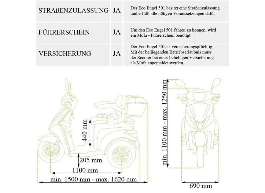 • Für E-Scooter wird Führerschein der Klasse AM, B, BE, A1, A2, A benötigt.