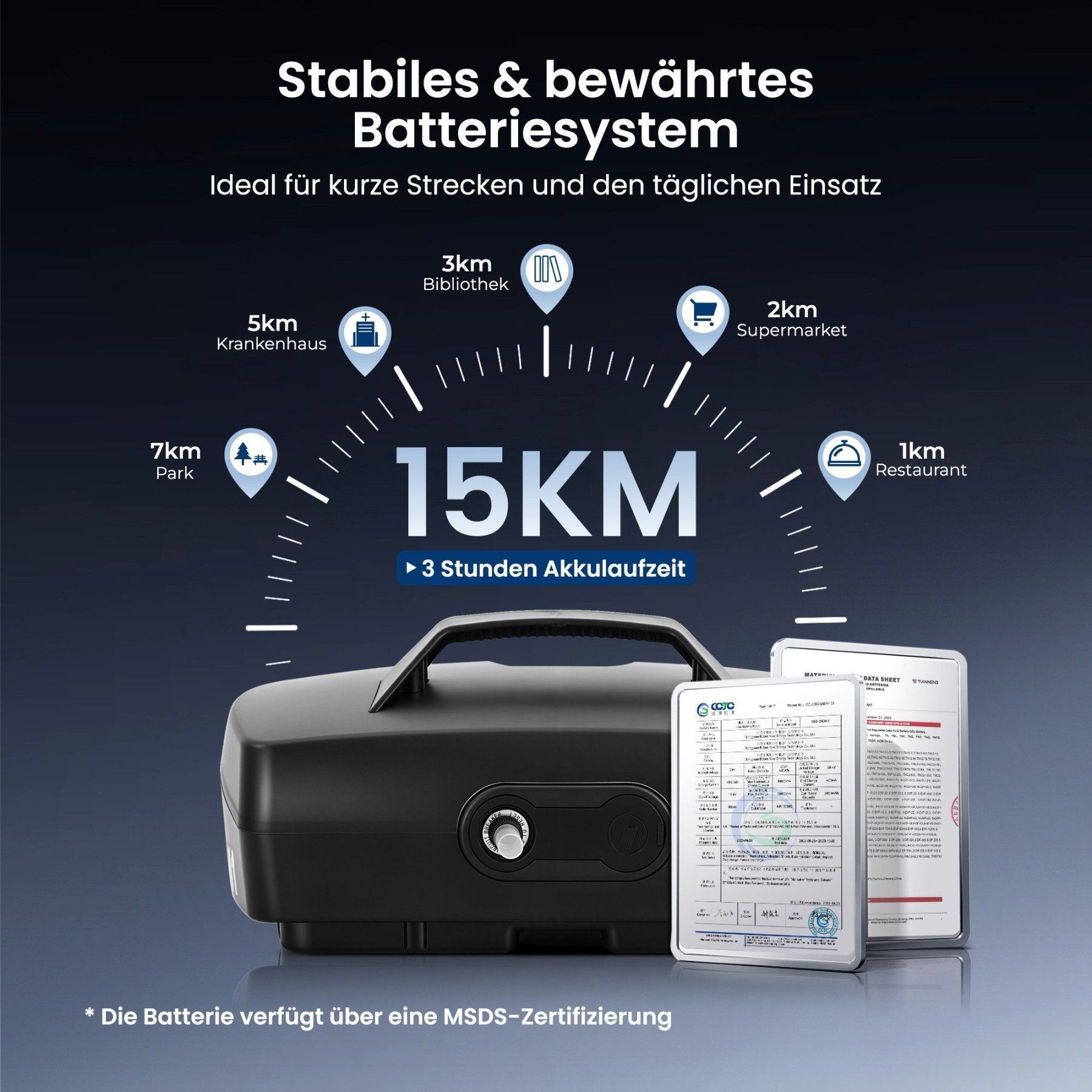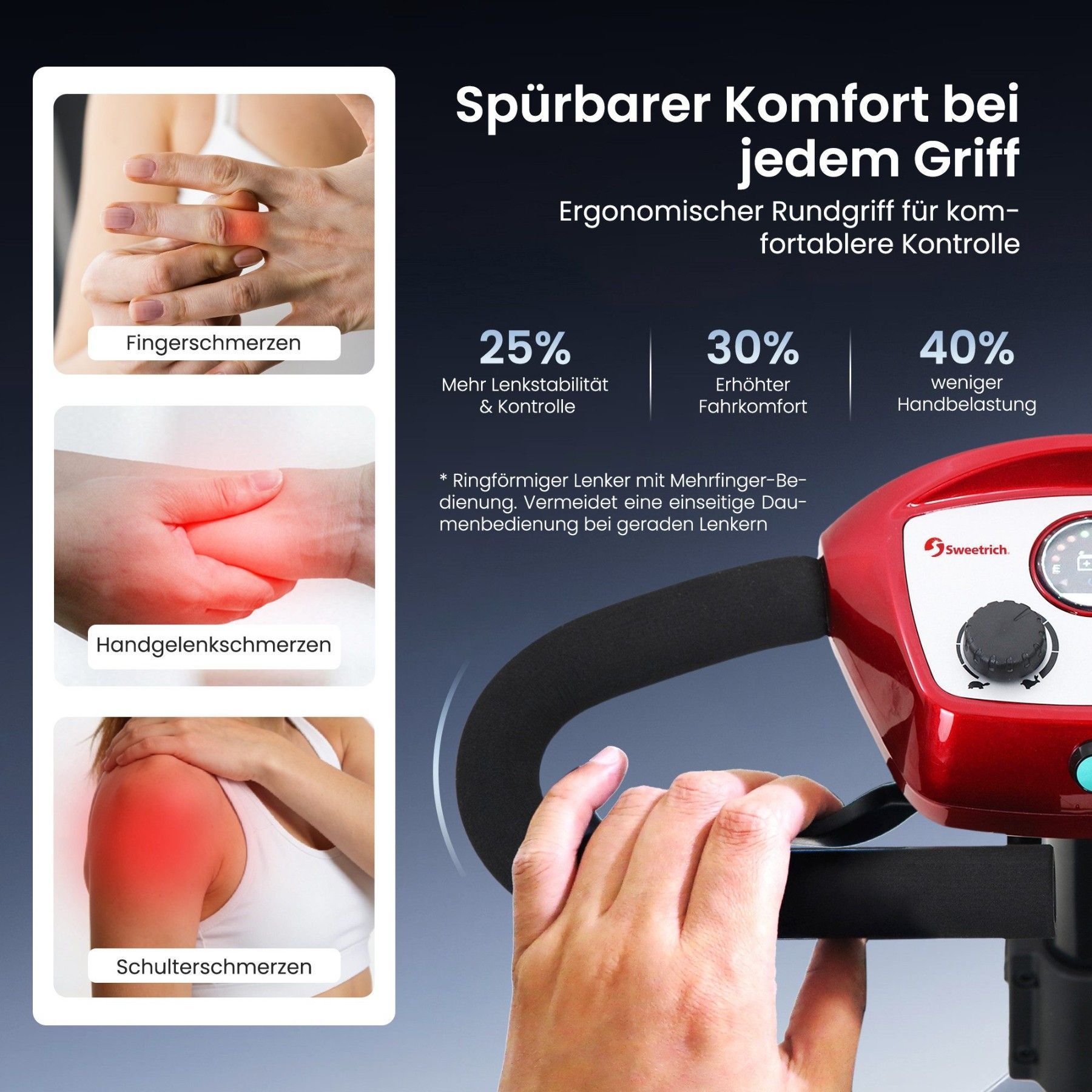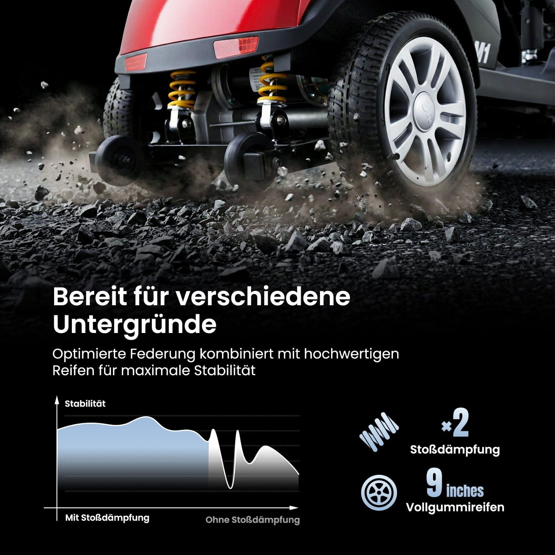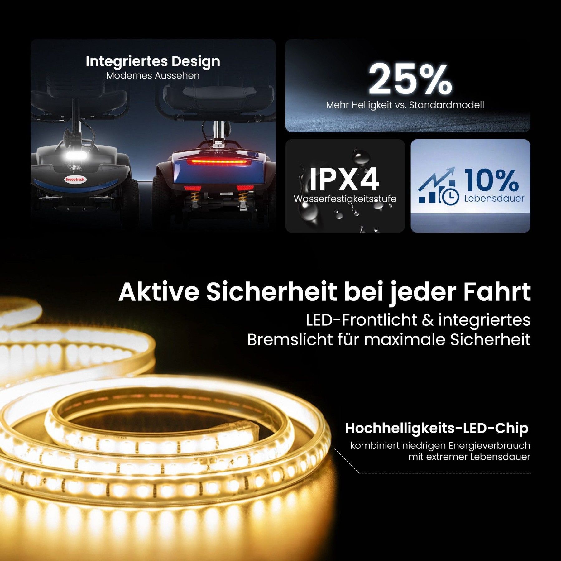 Automatische Bremse, Kippschutz, pannensichere Reifen und Lichtsystem – für stabile, sichere Fahrten bei Tag und Nacht, auch auf unebenem Terrain. Verstellbarer Sitz, flexible Armlehnen und Federung sorgen für ergonomisches Sitzen und hohen Komfort – ideal für längere Fahrten. Übersichtl