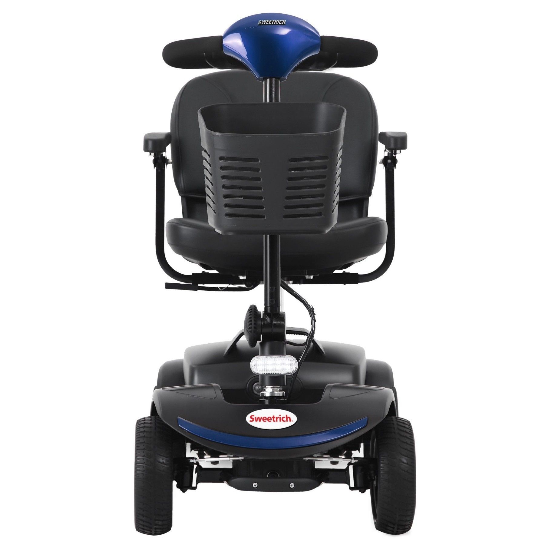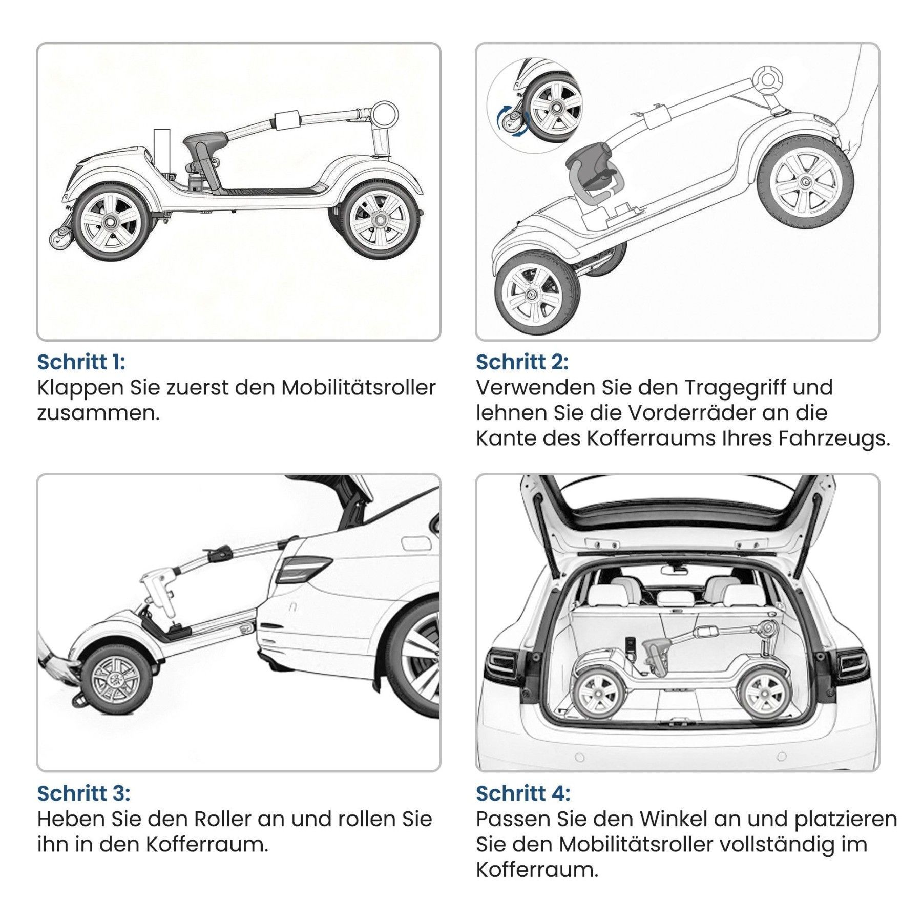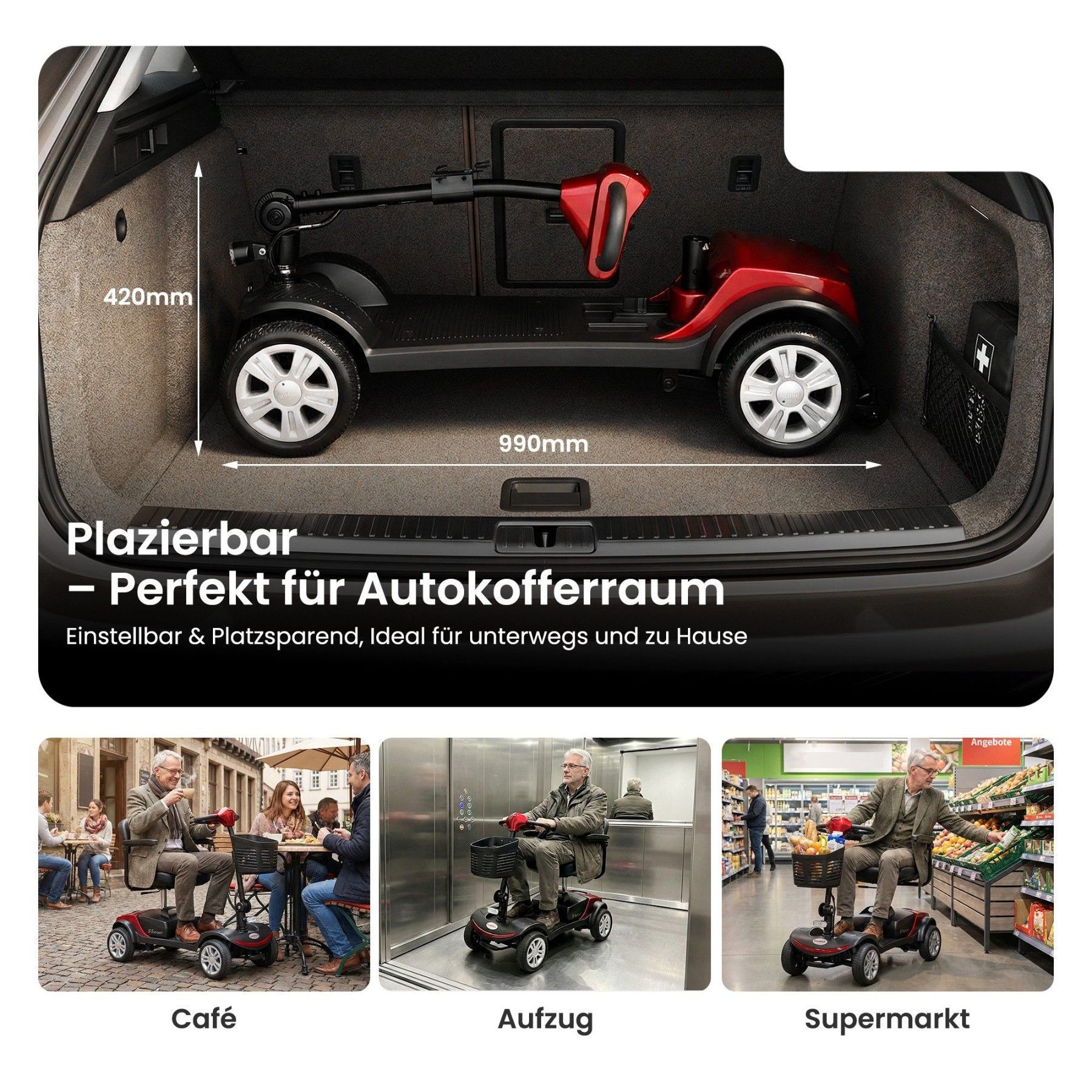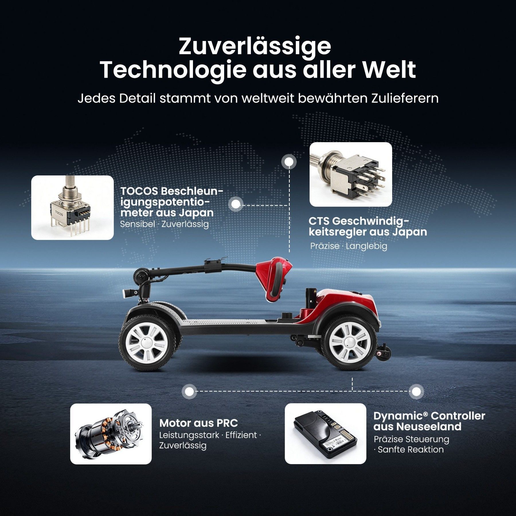 Automatische Bremse, Kippschutz, pannensichere Reifen und Lichtsystem – für stabile, sichere Fahrten bei Tag und Nacht, auch auf unebenem Terrain. Verstellbarer Sitz, flexible Armlehnen und Federung sorgen für ergonomisches Sitzen und hohen Komfort – ideal für längere Fahrten. Übersichtl