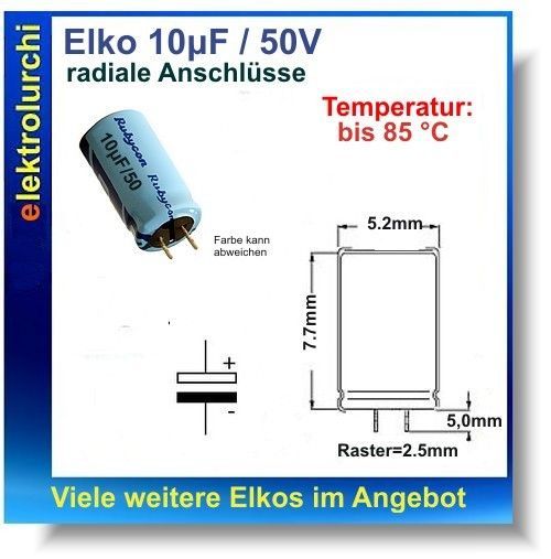 Sie bieten hier auf folgende Artikel NEU 10 Stück Elko 10µF 50V, 10uF, 85°C, RM=2,5mm, Durchschitt5mm x 8mm, Jamicon, Artikelbezeichnung: 10uF 50V Abmessungen: Durchschitt 5mm x H8mm Typ: Becherelko Temperatur: -40 bis 855°C Anschluß: radiale Anschlüsse Besonderheiten: Low Impedance, High Ripple Cur