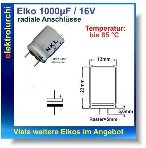 Sie bieten hier auf folgende Artikel NEU 5 Stück Elko 1000µF 16V, 1000uF, 85°C, RM=5mm, Durchschitt13mm x h23mm, NKL Artikelbezeichnung: 1000µF 16V Abmessungen: Durchschitt 13mm x H23 mm Rastermaß: 5mm Typ: Becherelko Temperatur: -40 bis 85°C Anschluß: radiale Anschlüsse Besonderheiten: Low Impedanc