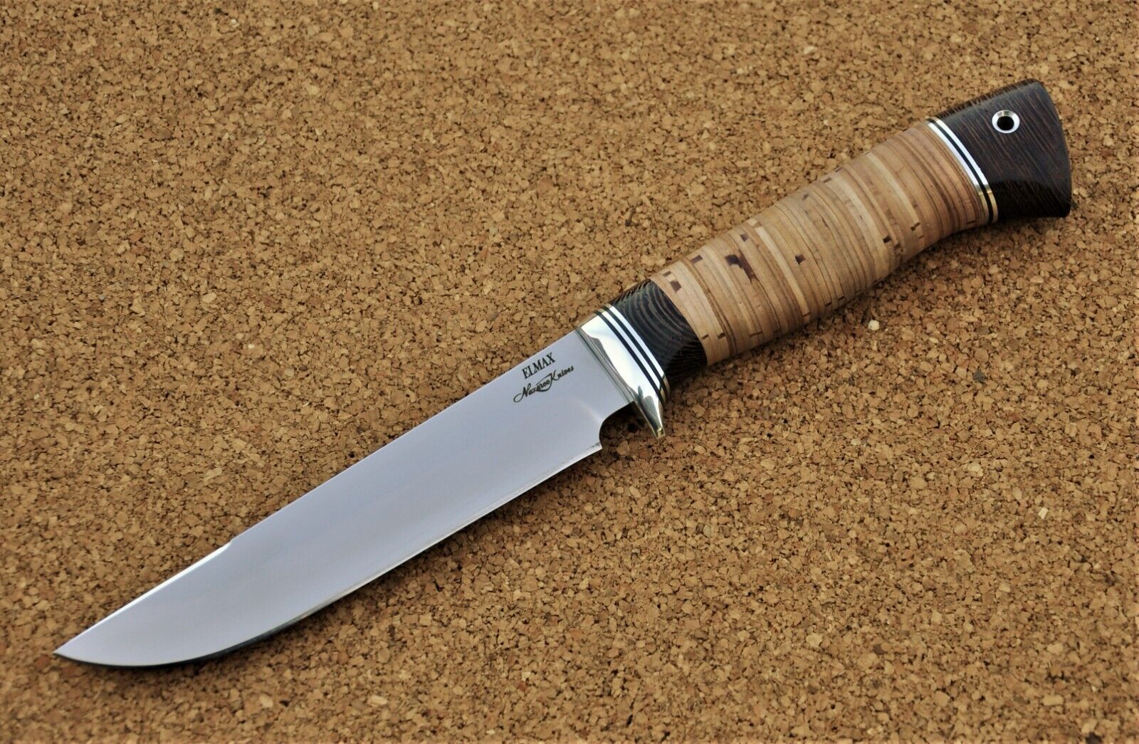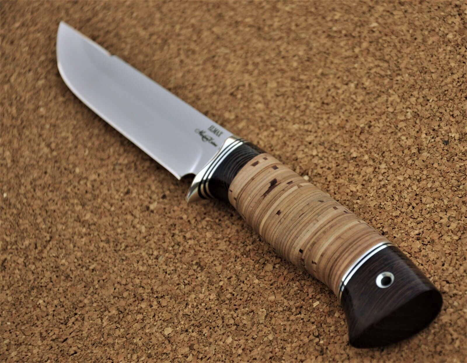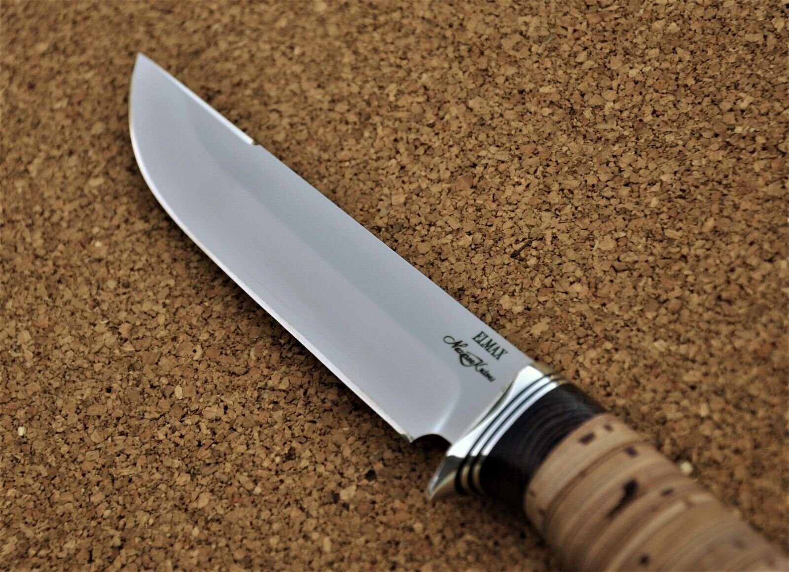 Zum Verkauf steht ein Jagdmesser aus rostfreiem Stahl Elmax der Firma Nazarov Knives aus Russland. Parameter: Messerlänge: ca. 253 mm Klingenlänge: ca. 133 mm Rückenstärke: ca. 2,4 mm Klingenbreite: ca. 25 mm Stahl: Elmax (poliert) HRC: 62 Griffmaterial: Birkenrinde+Wenge+Alu Gewicht: ca. 109 Gramm