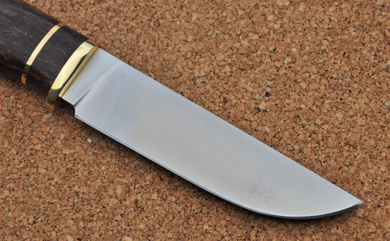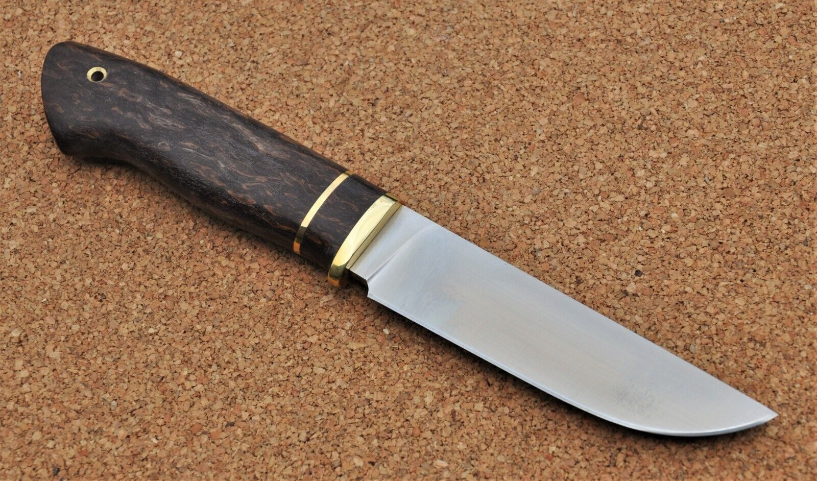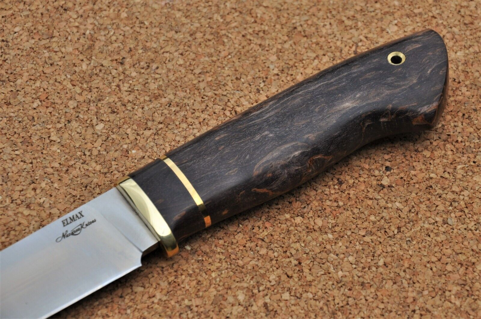 Zum Verkauf steht ein Jagdmesser aus rostfreiem Stahl Elmax der Firma Nazarov Knives aus Russland. Parameter: Messerlänge: ca. 255 mm Klingenlänge: ca. 130 mm Rückenstärke: ca. 3,5 mm Klingenbreite: ca. 29 mm Stahl: Elmax (satiniert) HRC: 62 Griffmaterial: stabilisierte karelische Birke+Messing Gewi