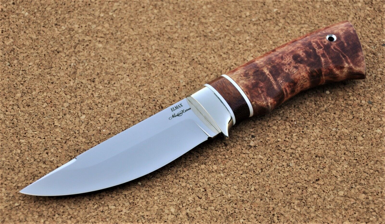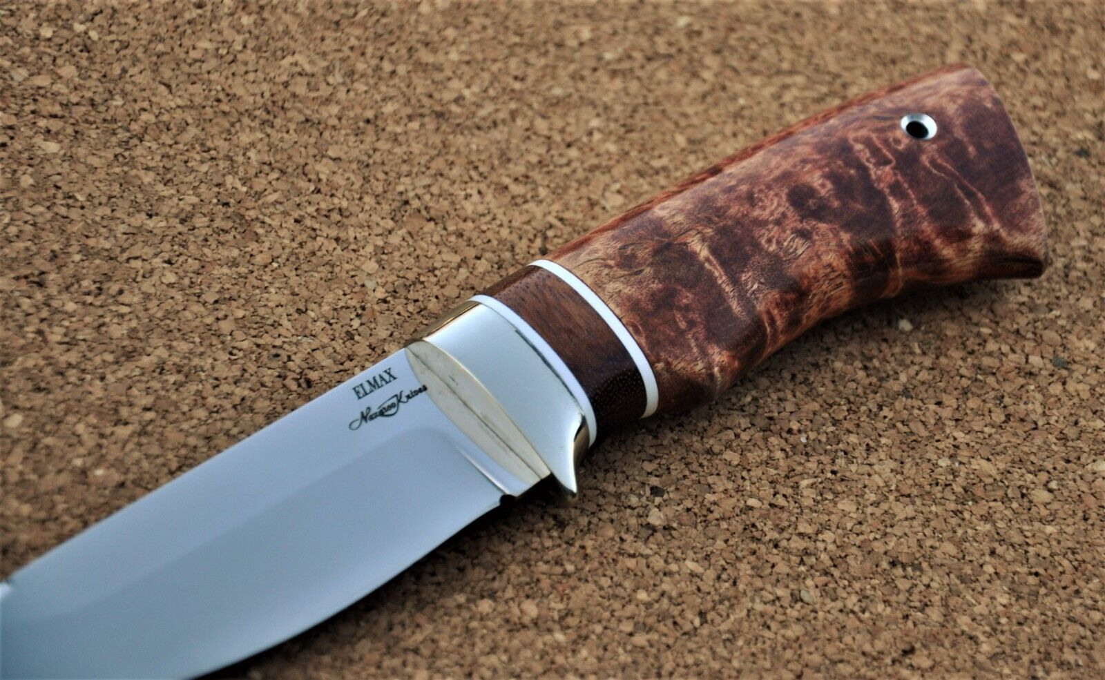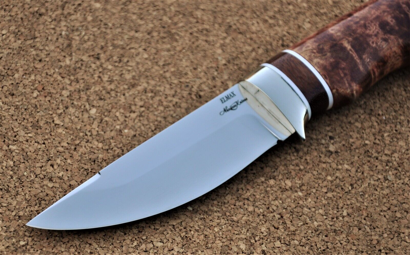 Zum Verkauf steht ein Jagdmesser aus rostfreiem Stahl Elmax der Firma Nazarov Knives aus Russland. Parameter: Messerlänge: ca. 232 mm Klingenlänge: ca. 127 mm Rückenstärke: ca. 2,3 mm Klingenbreite: ca. 33 mm Stahl: Elmax (poliert) HRC: 62 Griffmaterial: stabilisierte karelische Birke+Acryl+Melchior