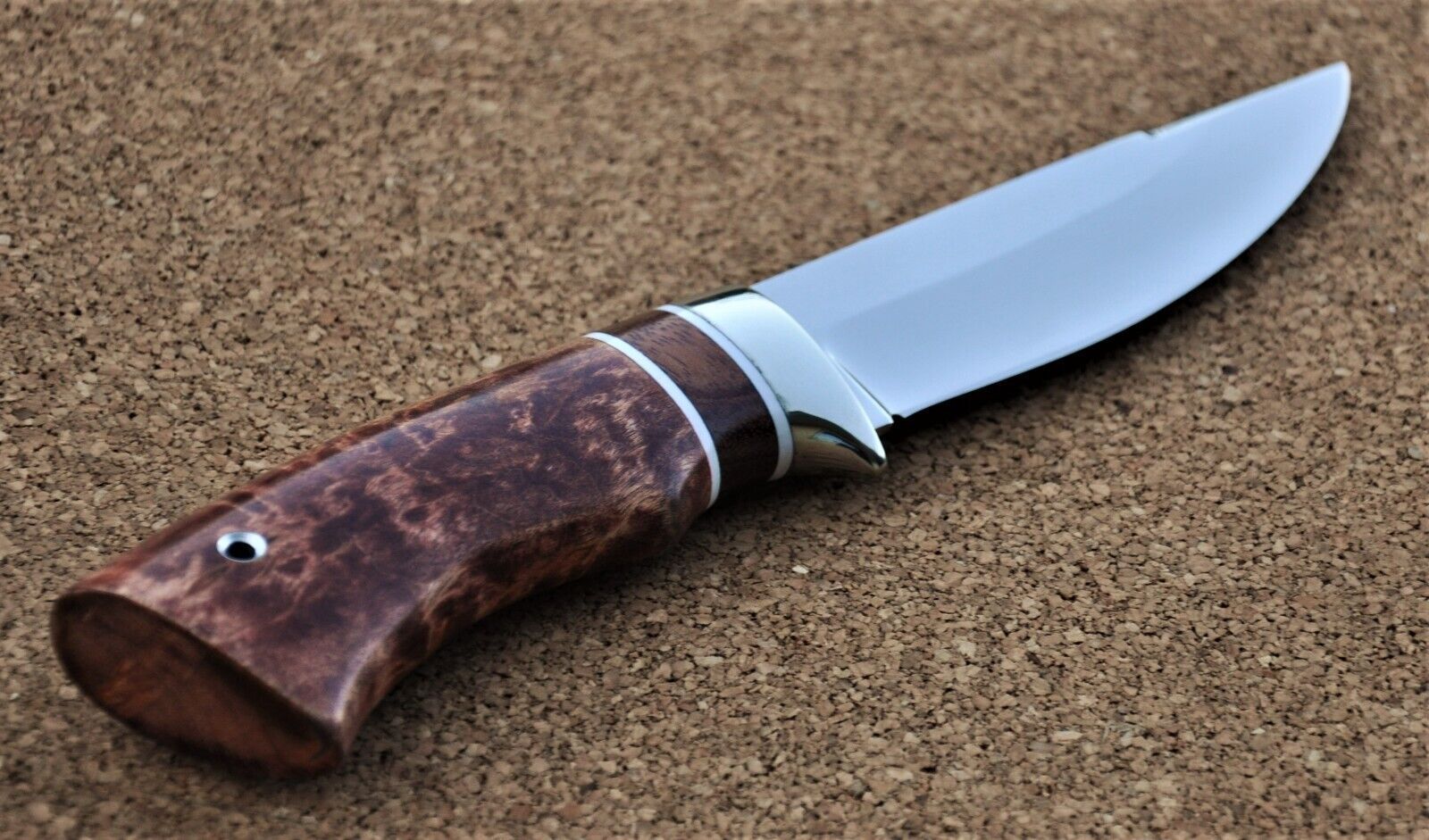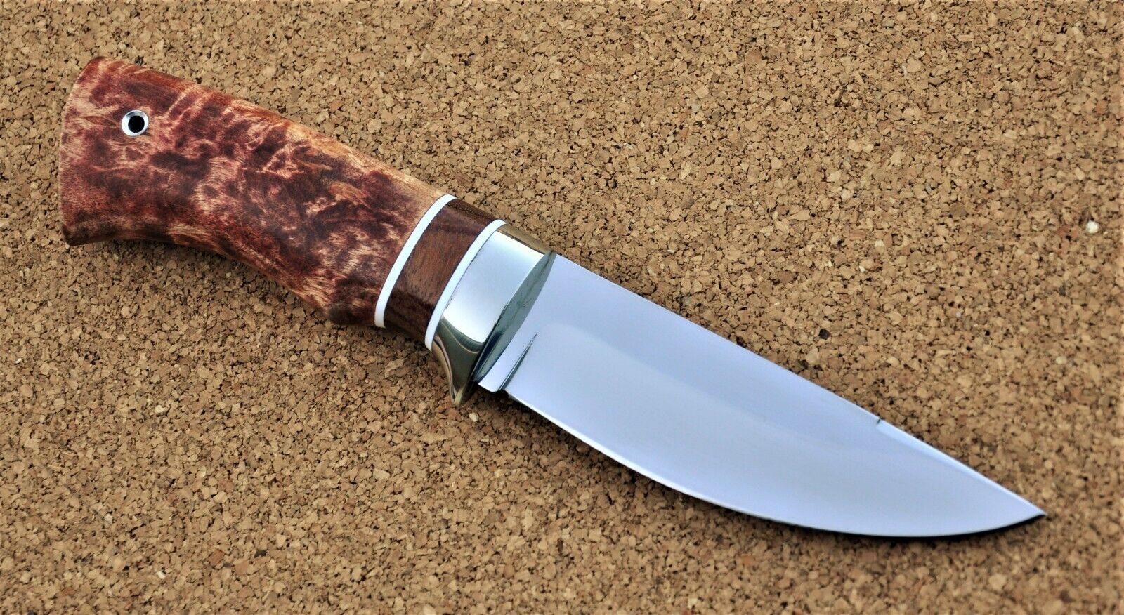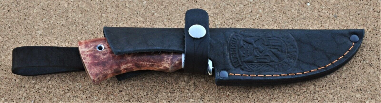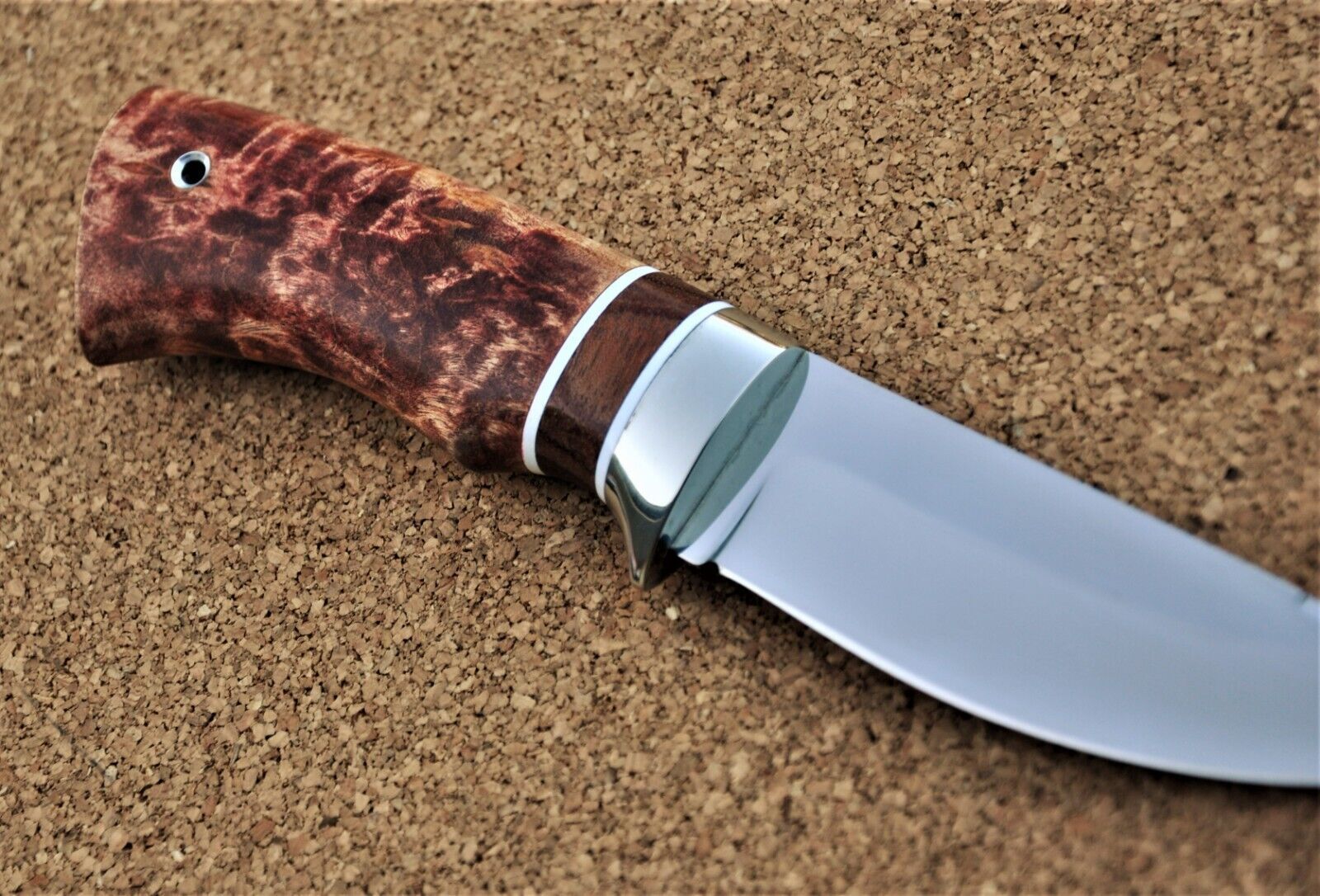 Zum Verkauf steht ein Jagdmesser aus rostfreiem Stahl Elmax der Firma Nazarov Knives aus Russland. Parameter: Messerlänge: ca. 232 mm Klingenlänge: ca. 127 mm Rückenstärke: ca. 2,3 mm Klingenbreite: ca. 33 mm Stahl: Elmax (poliert) HRC: 62 Griffmaterial: stabilisierte karelische Birke+Acryl+Melchior