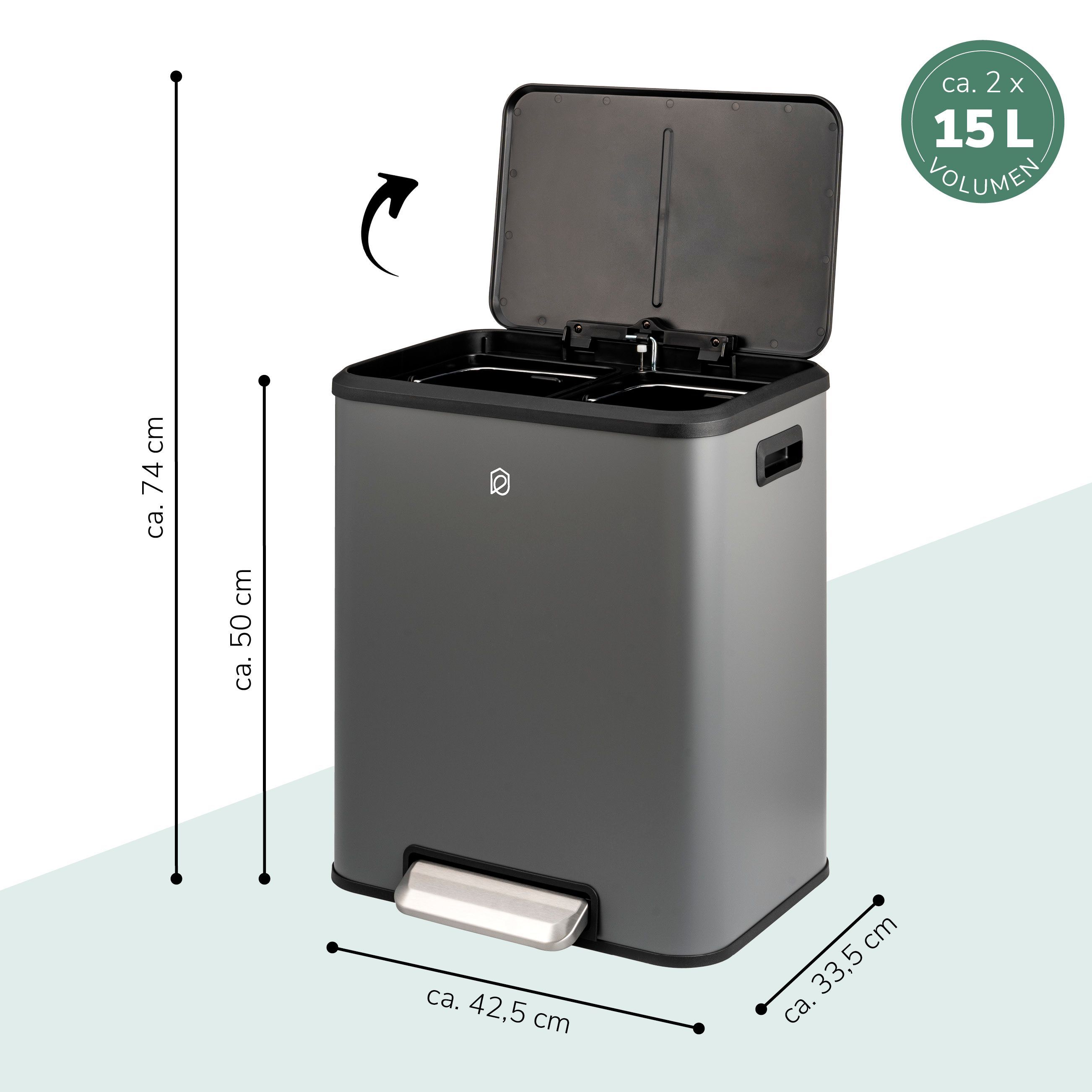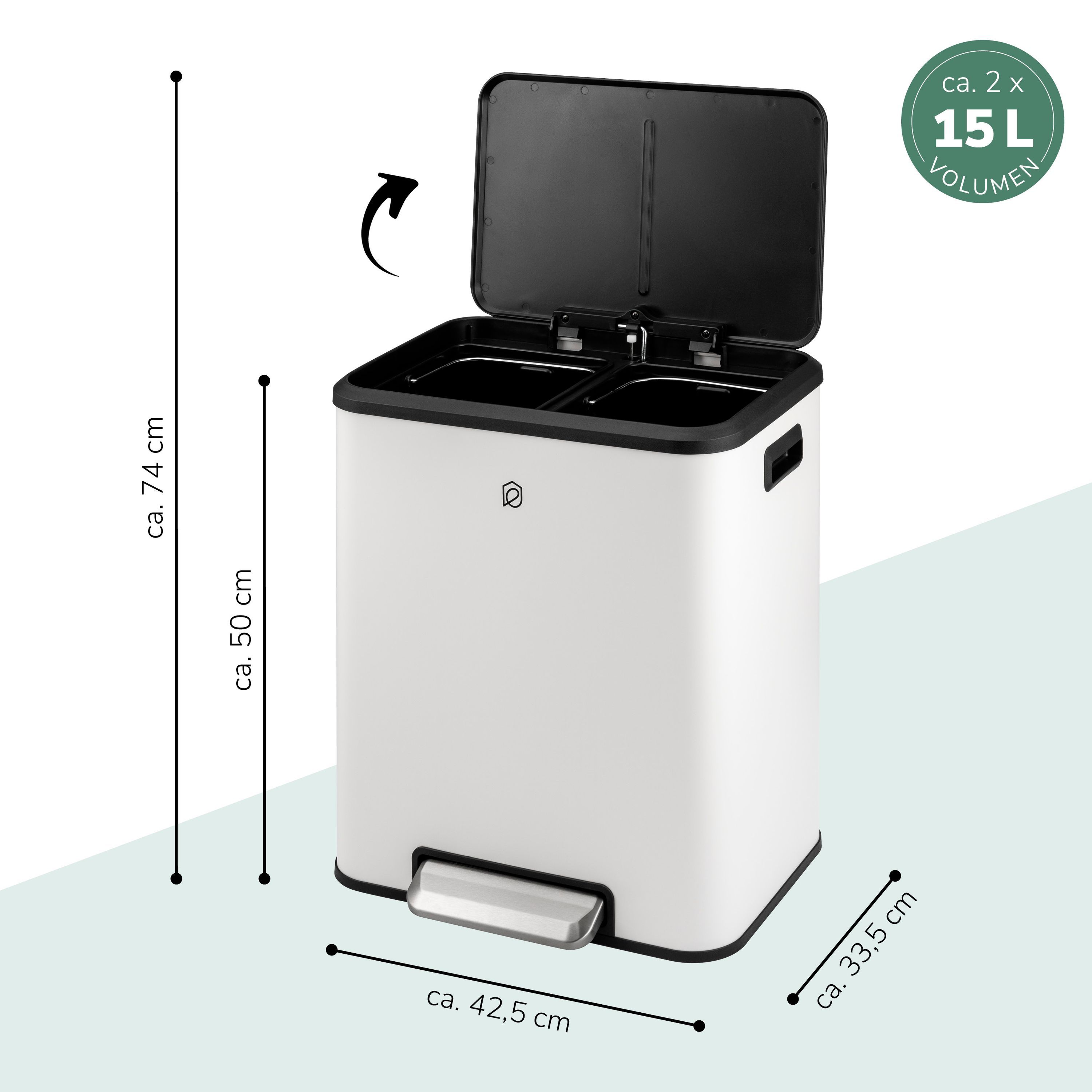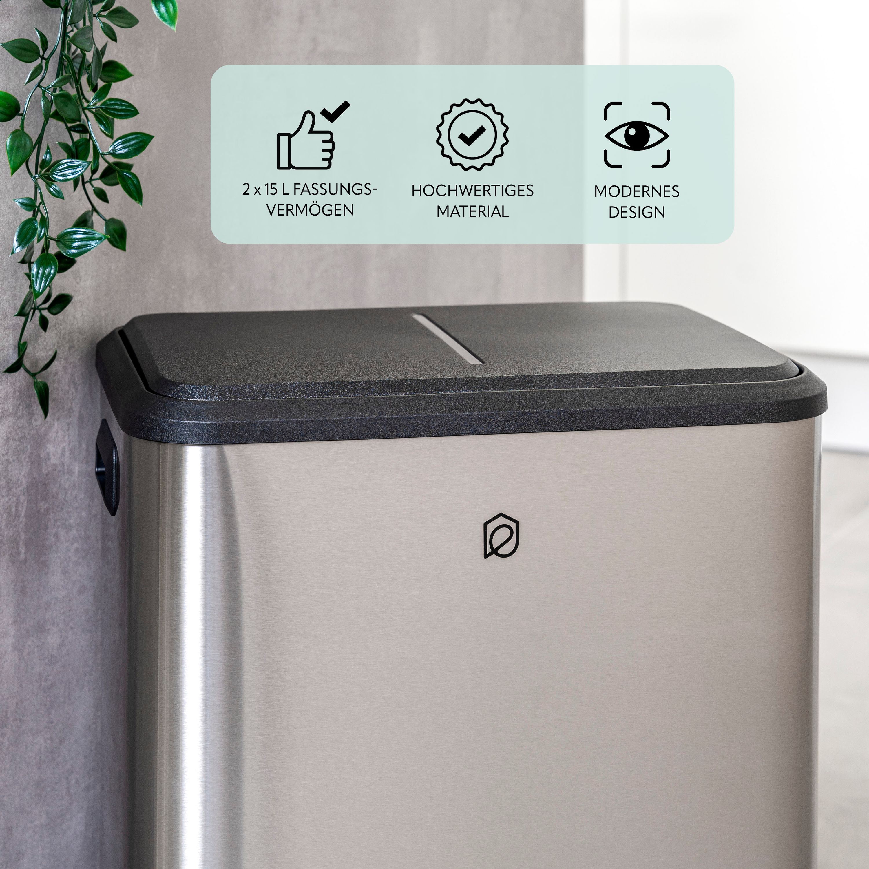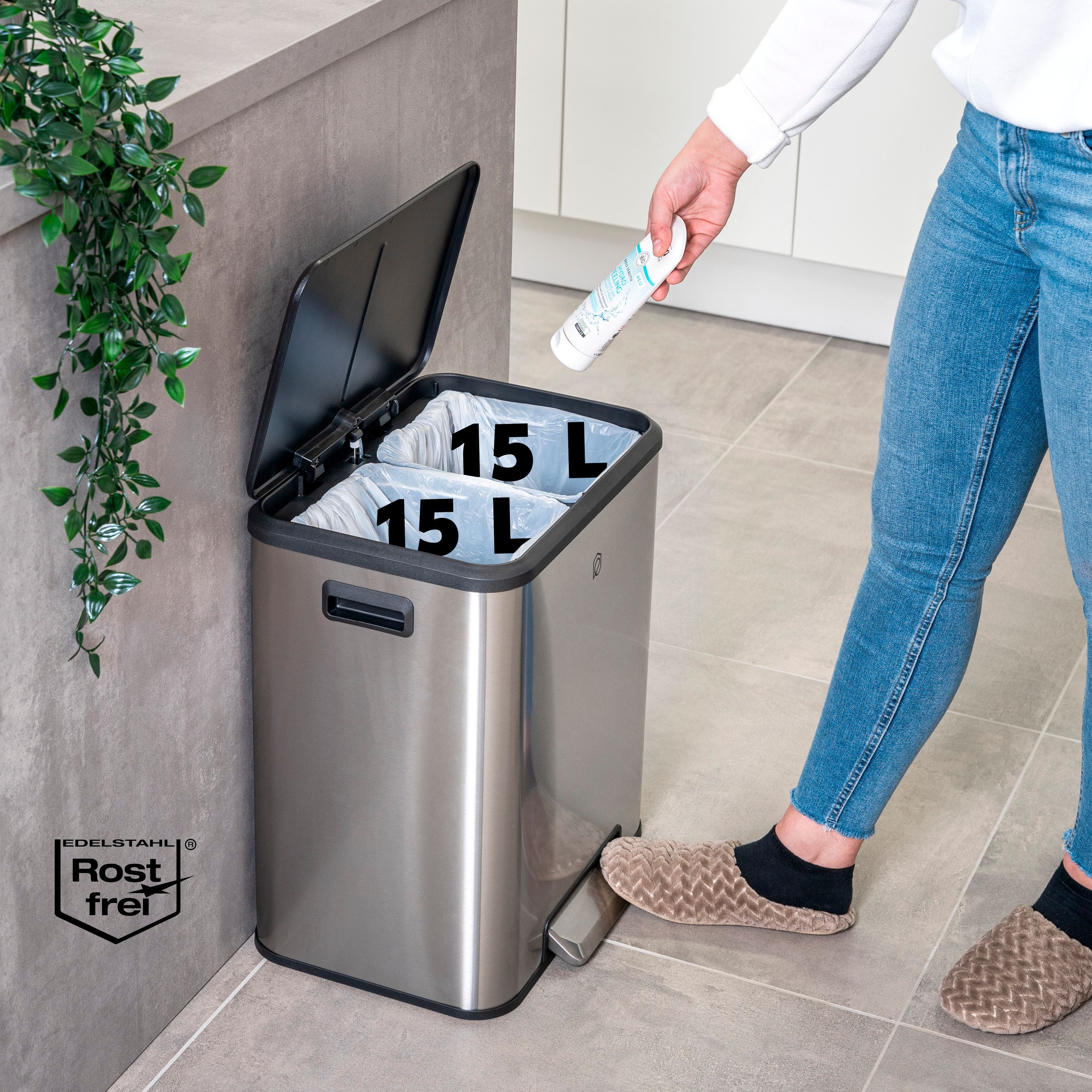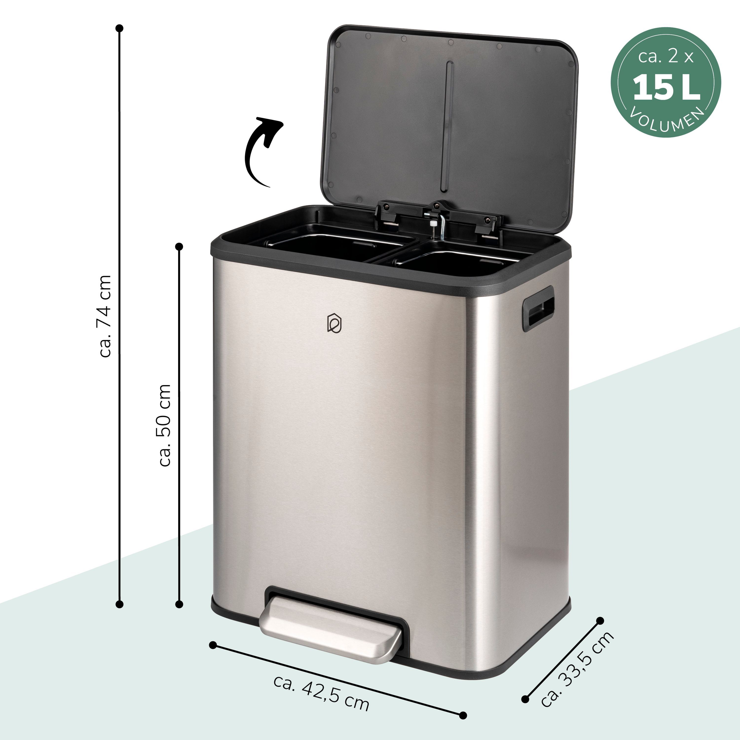 eluno Abfalleimer, Treteimer - 2 Abteile je 15 Liter Fassungsvermögen