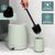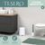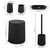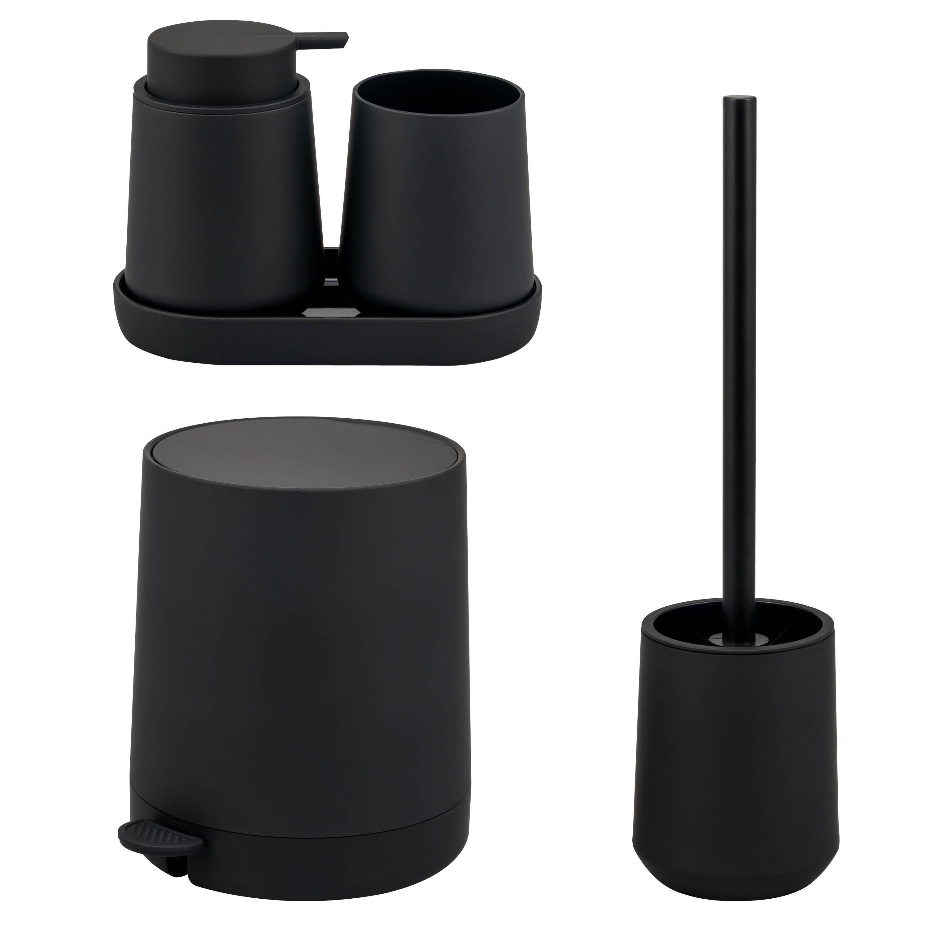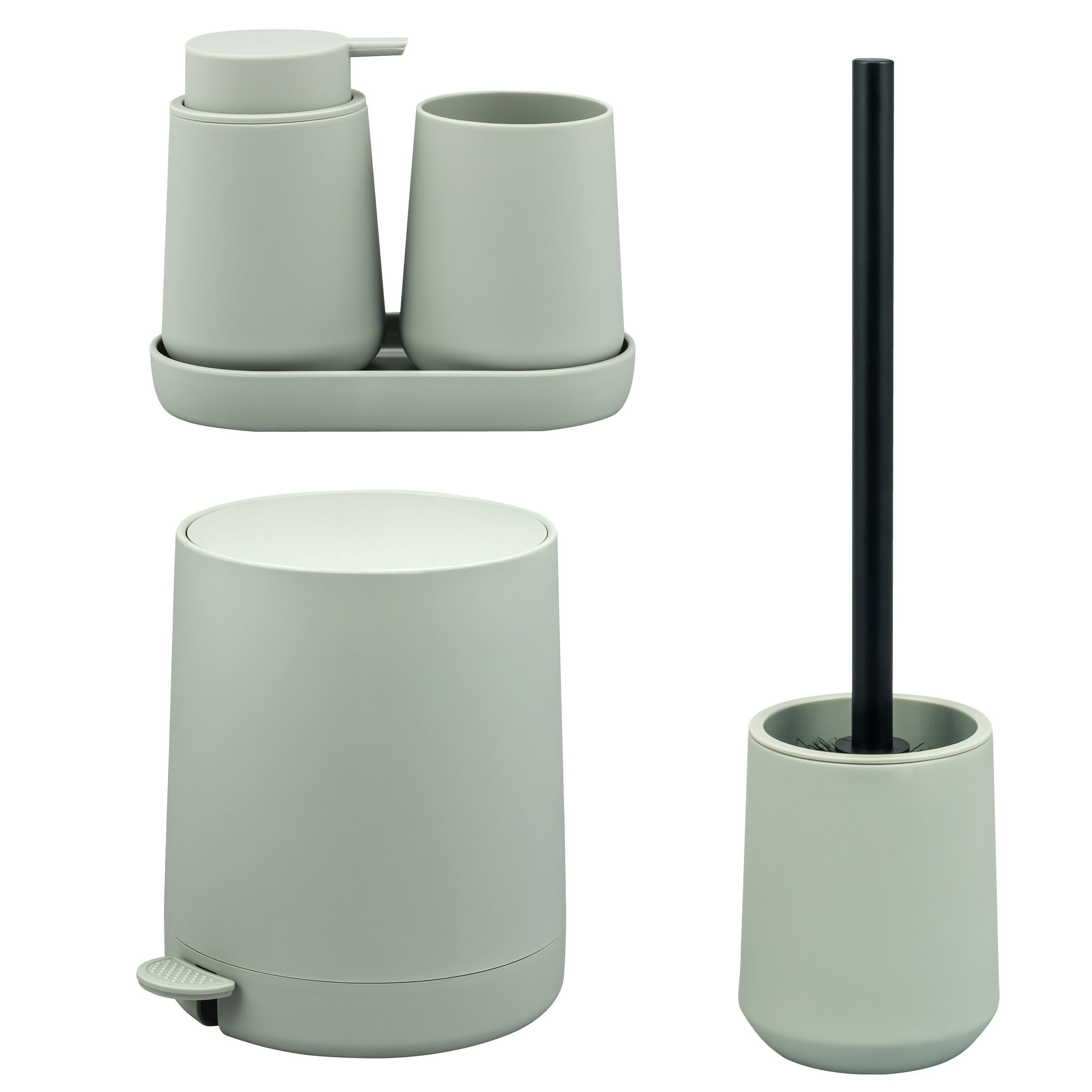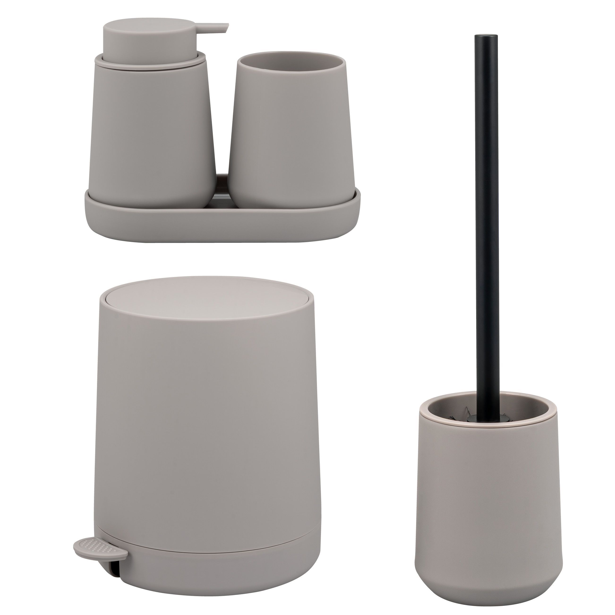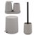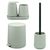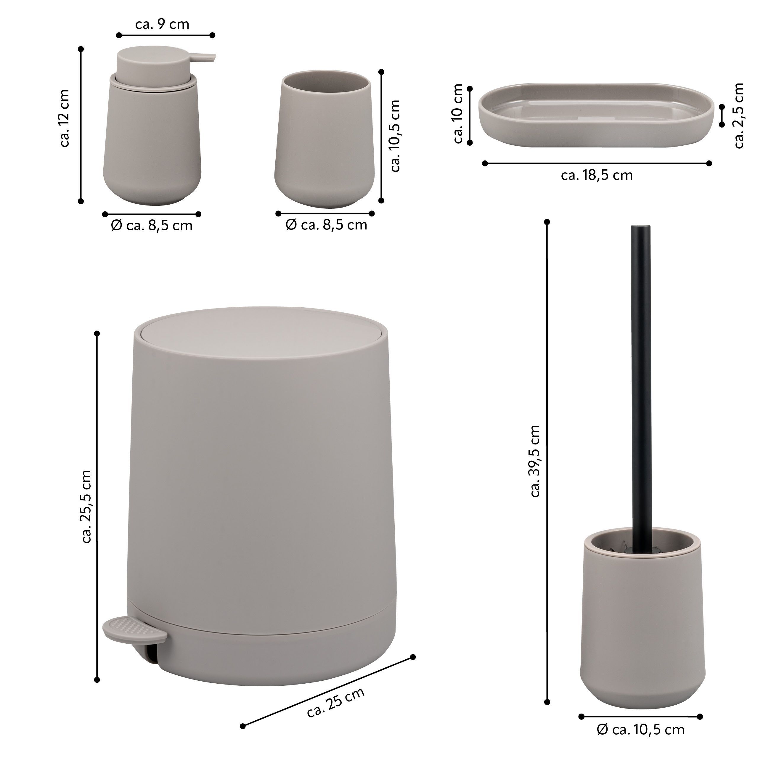 Abmessungen (B/H/T) : Seifenspender ca. 8,5 x 12 x 9 cm, Becher ca. 8,5 x 10,5 cm (Ø/H), Schale ca. 18,5 x 2,5 x 10 cm, Bürste ca. 10,5 x 39,5 x 10,5 cm, Eimer ca. 22,5 x 25,5 x 25 cm