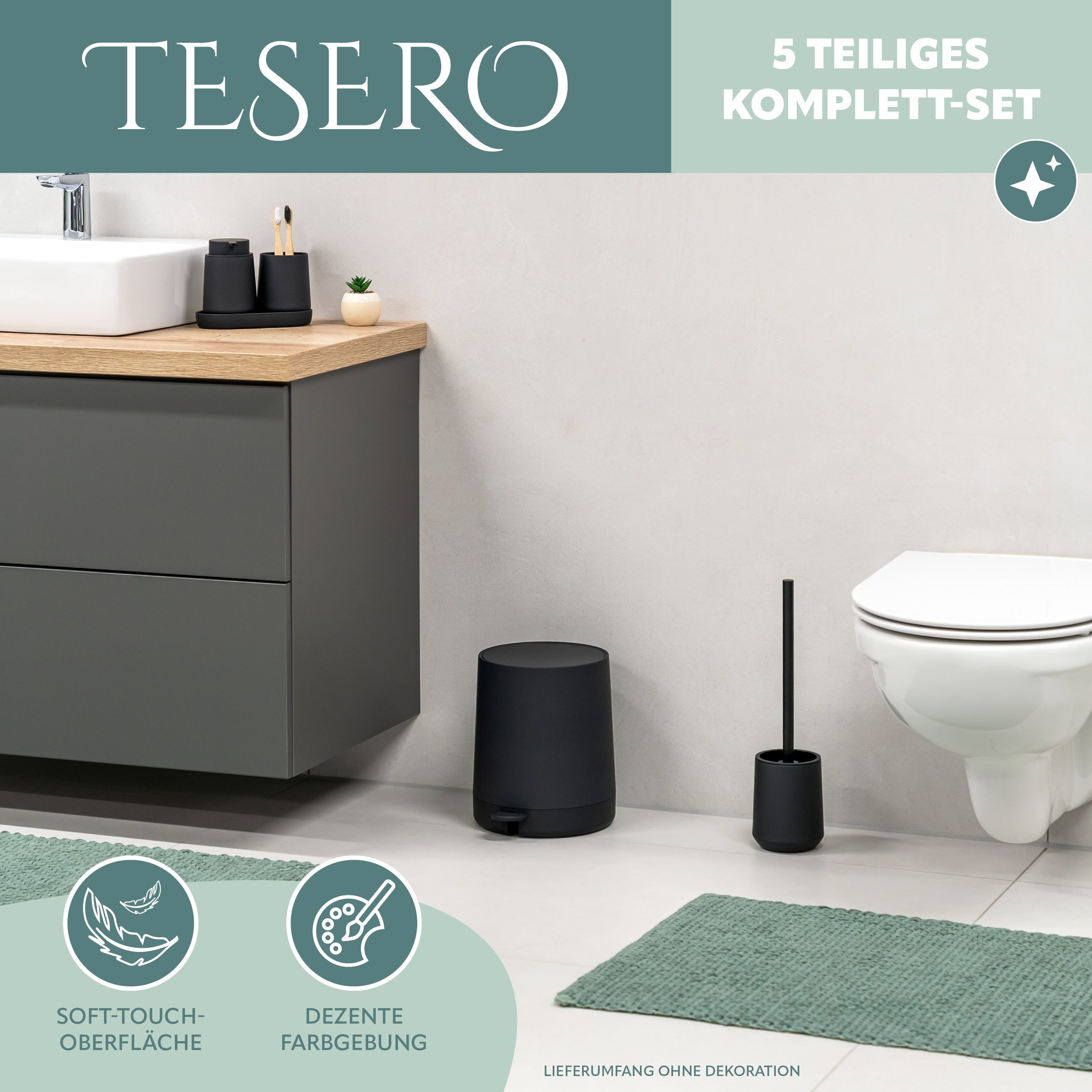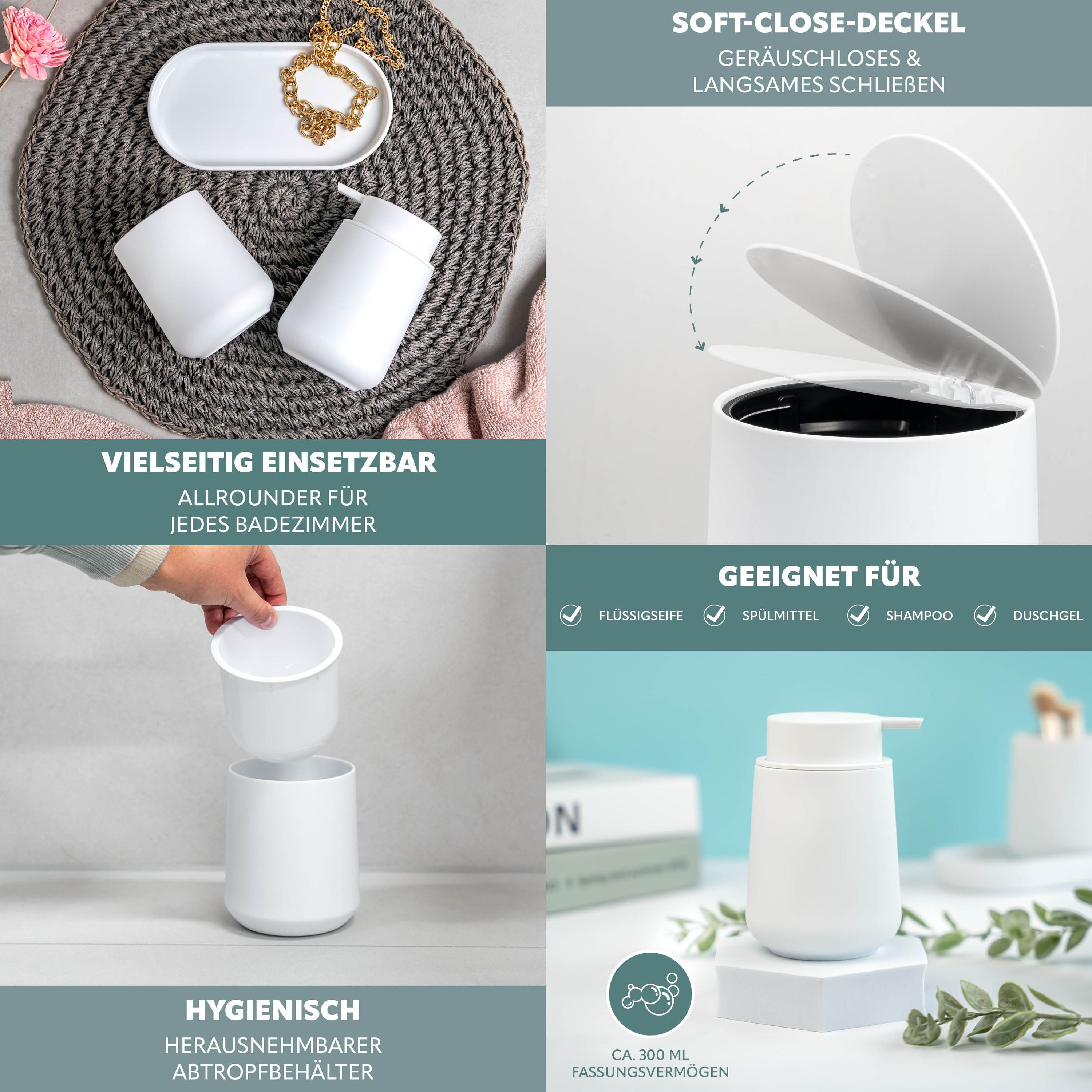 Bad-Accessoires Set - inkl. Seifenspender, Becher und Schale, nachfüllbarer Seifenspender mit ca. 300 ml Fassungsvermögen