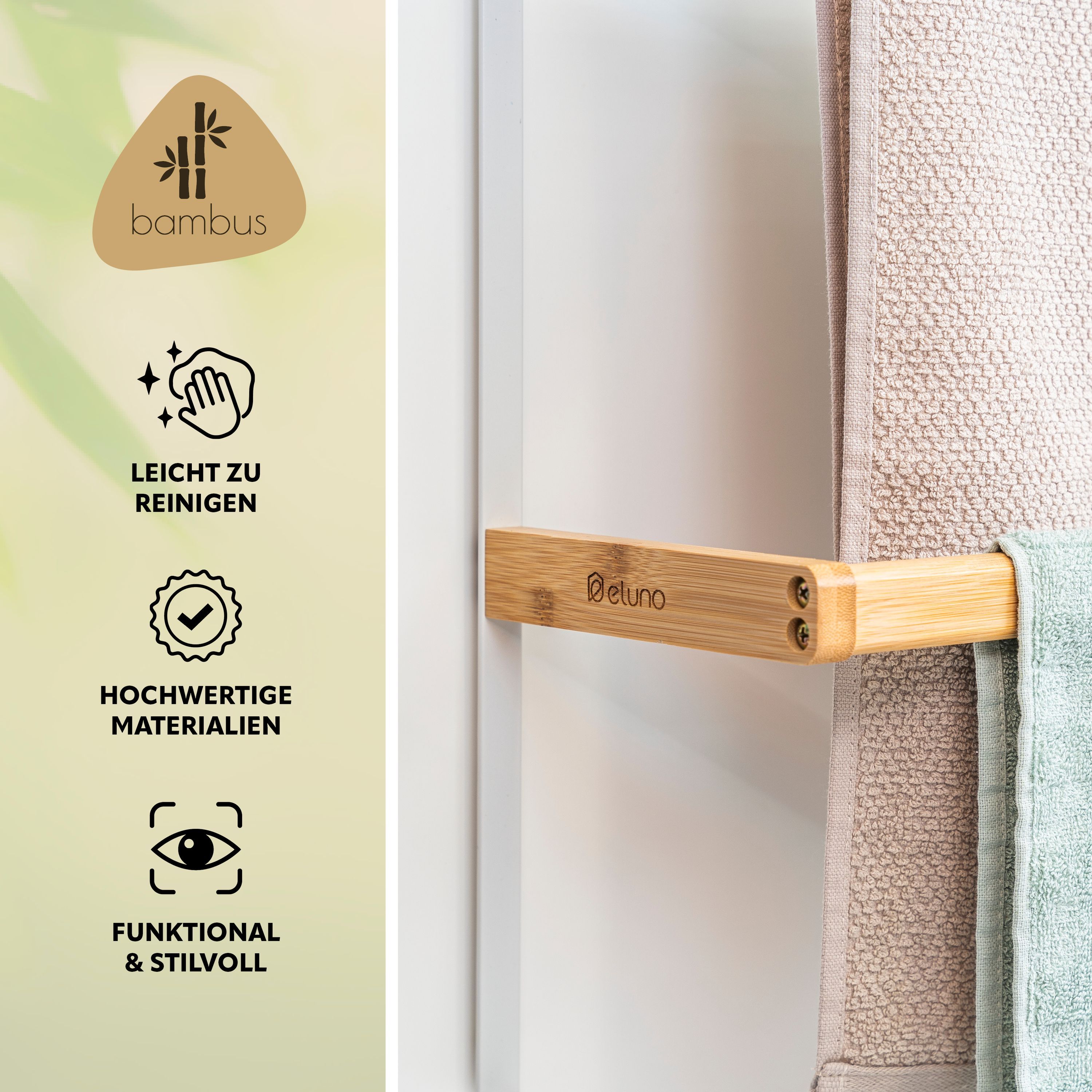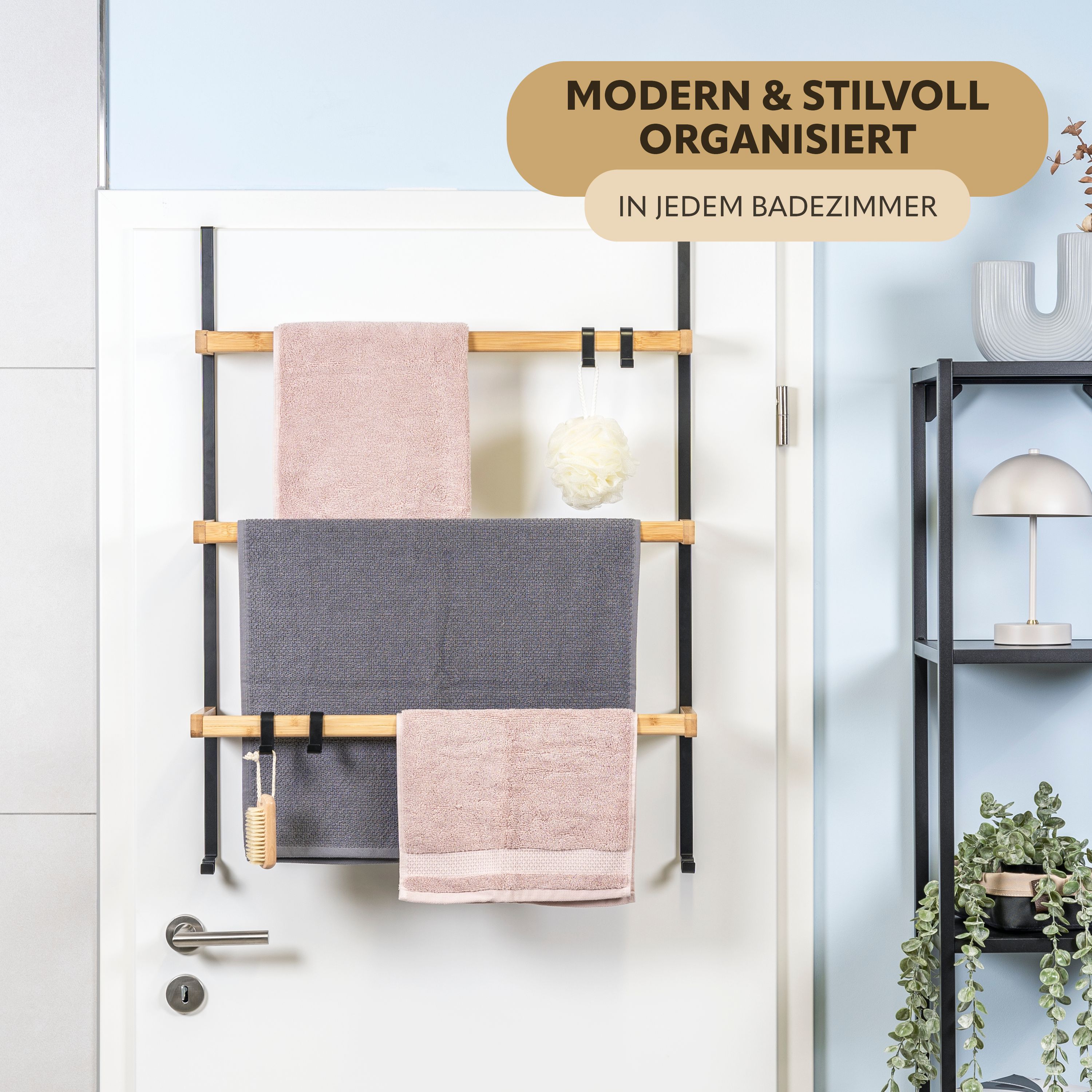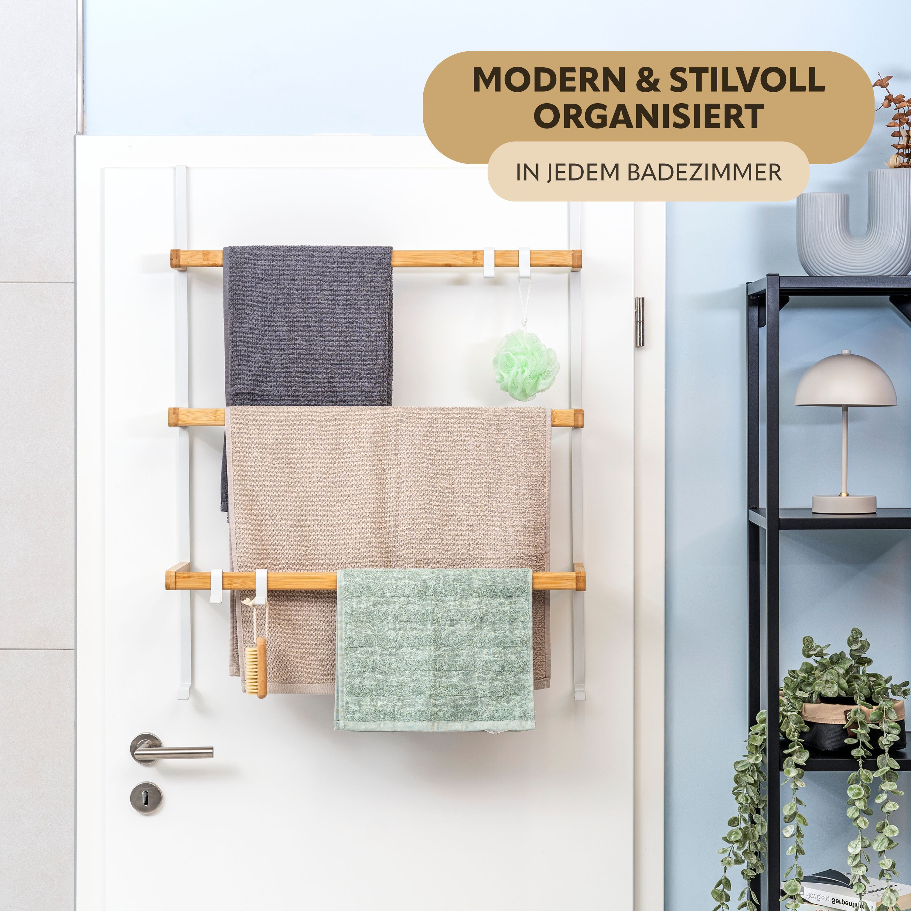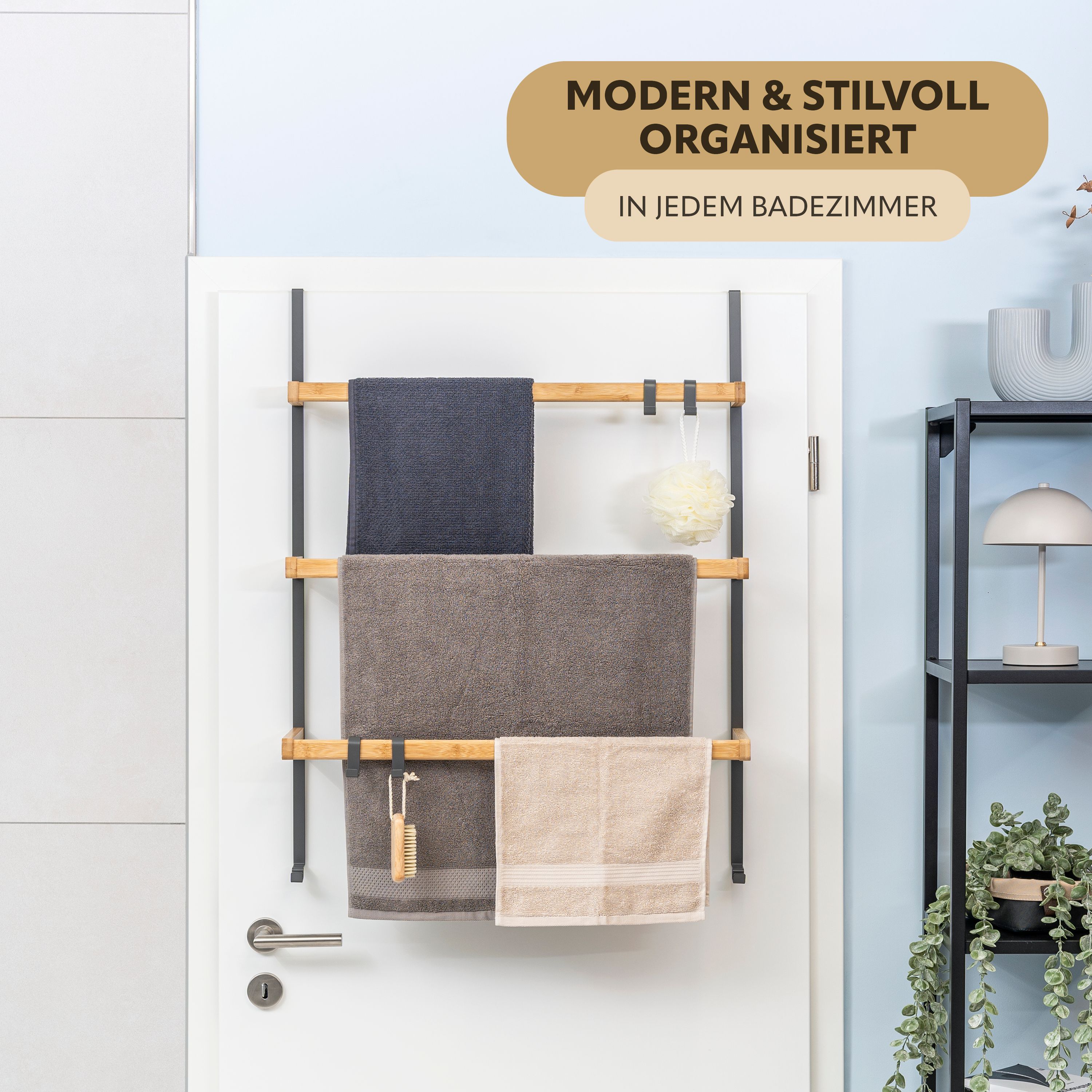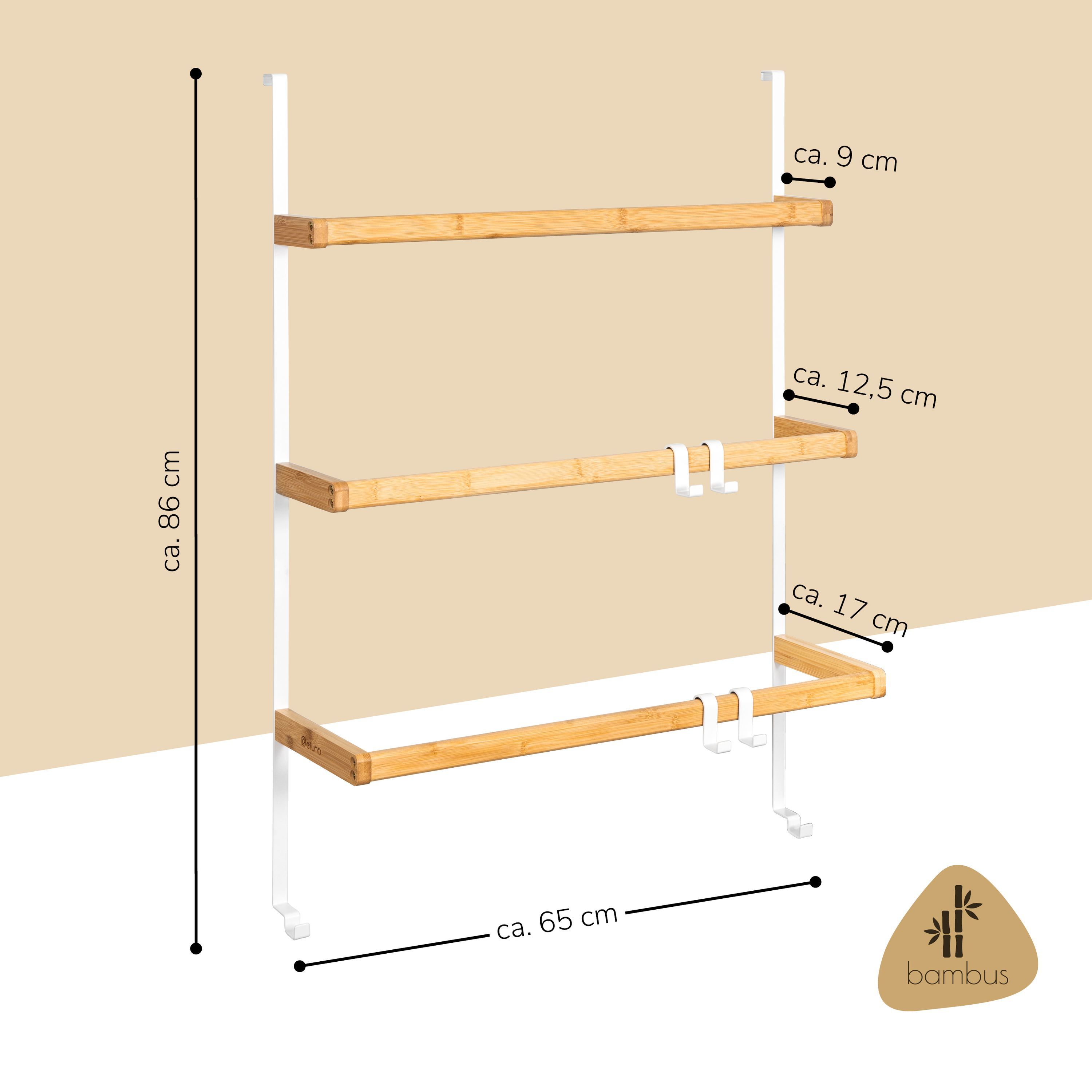 eluno Tür-Hängeregal aus Metall und Bambus, 3 Handtuchstangen, 4 Haken