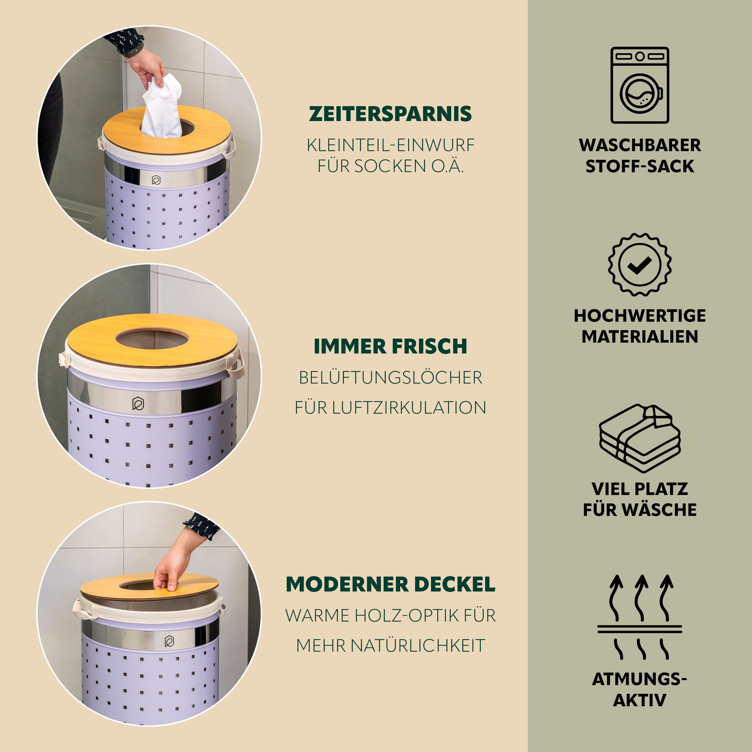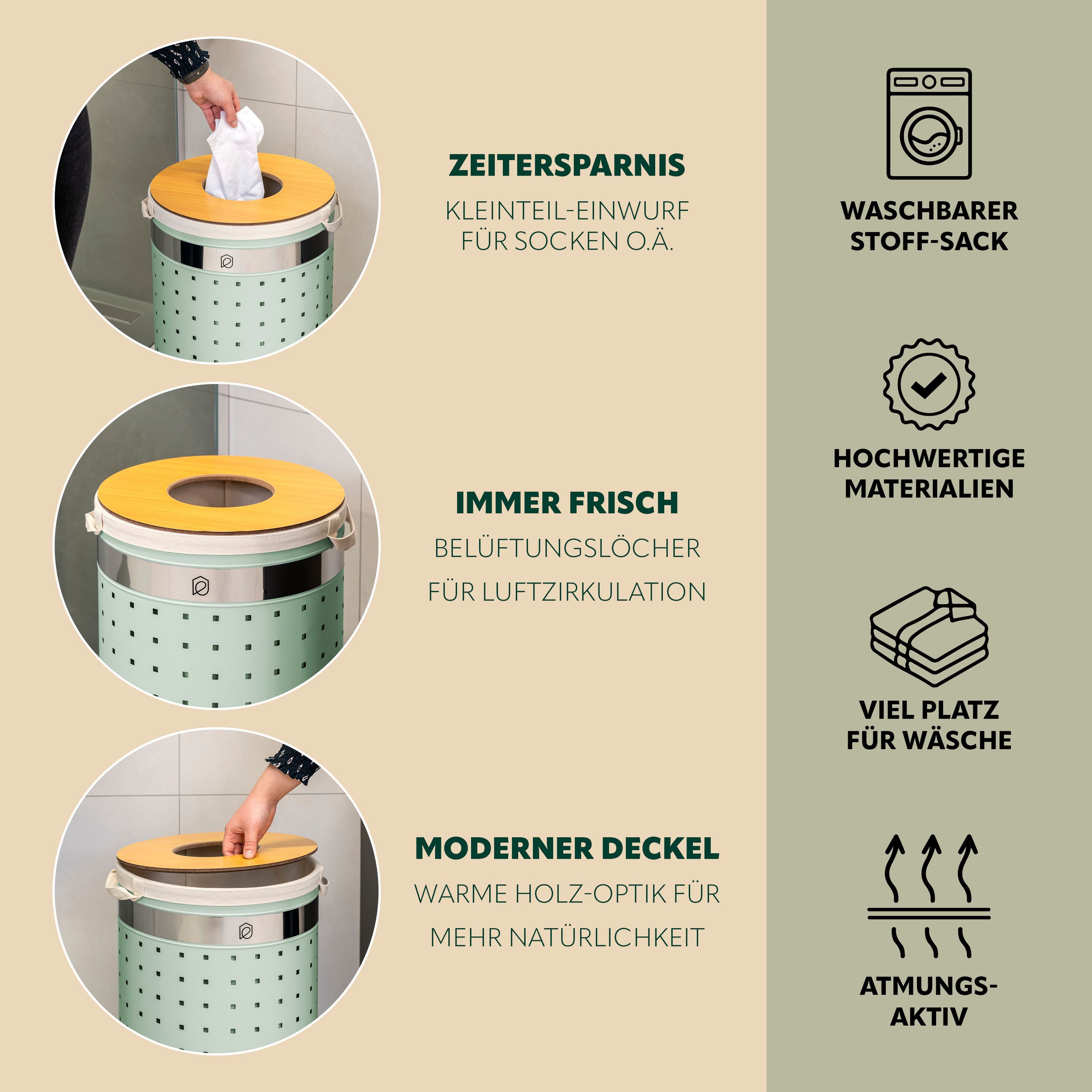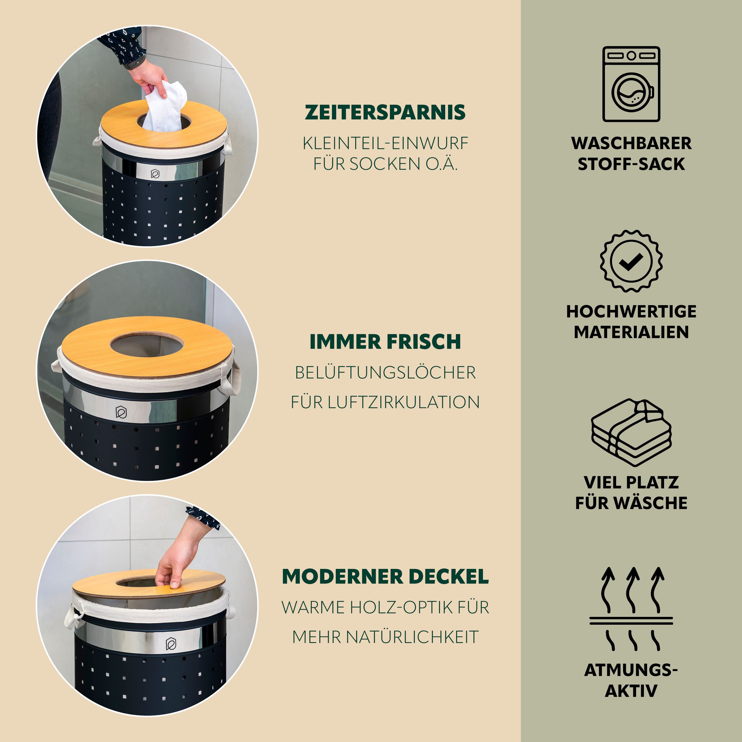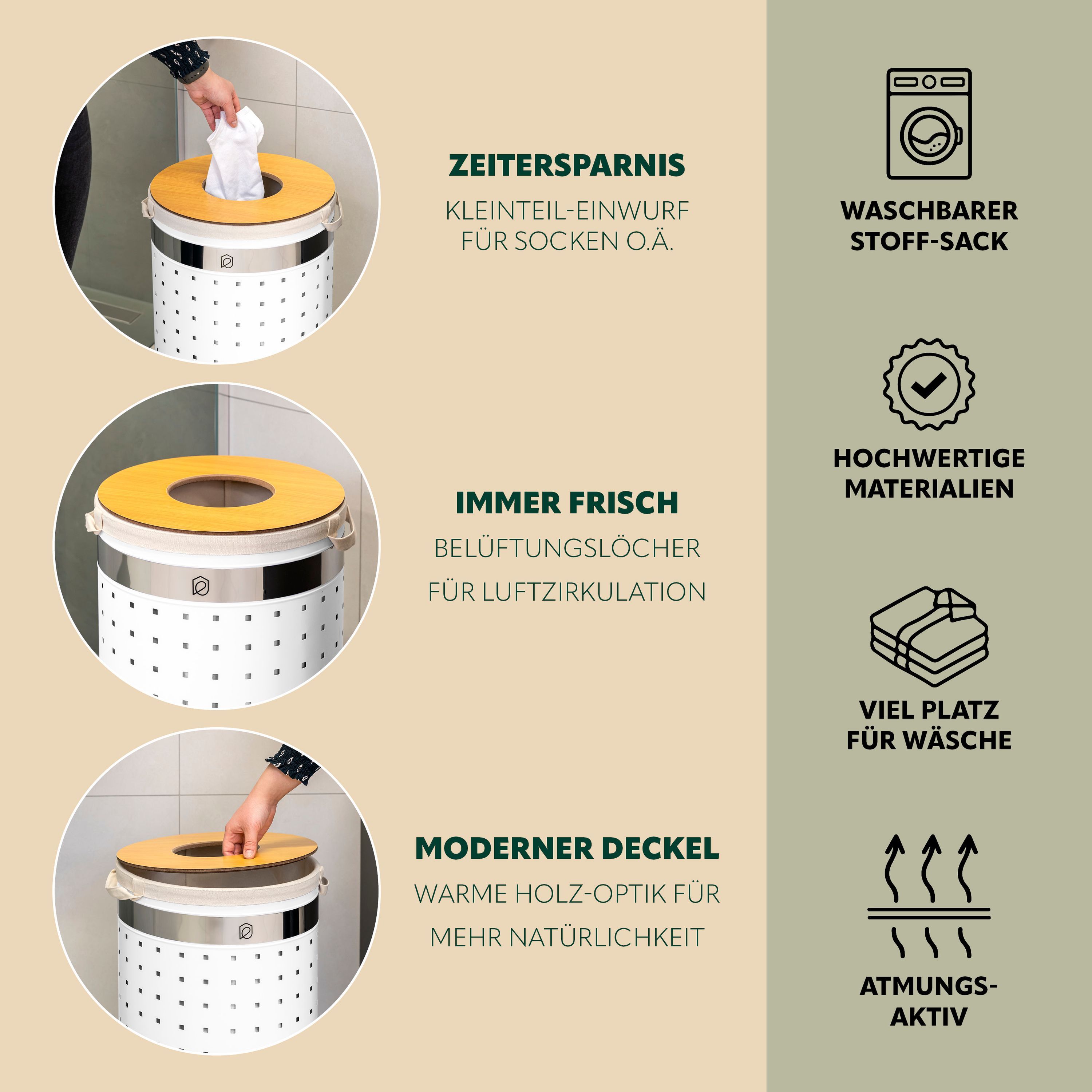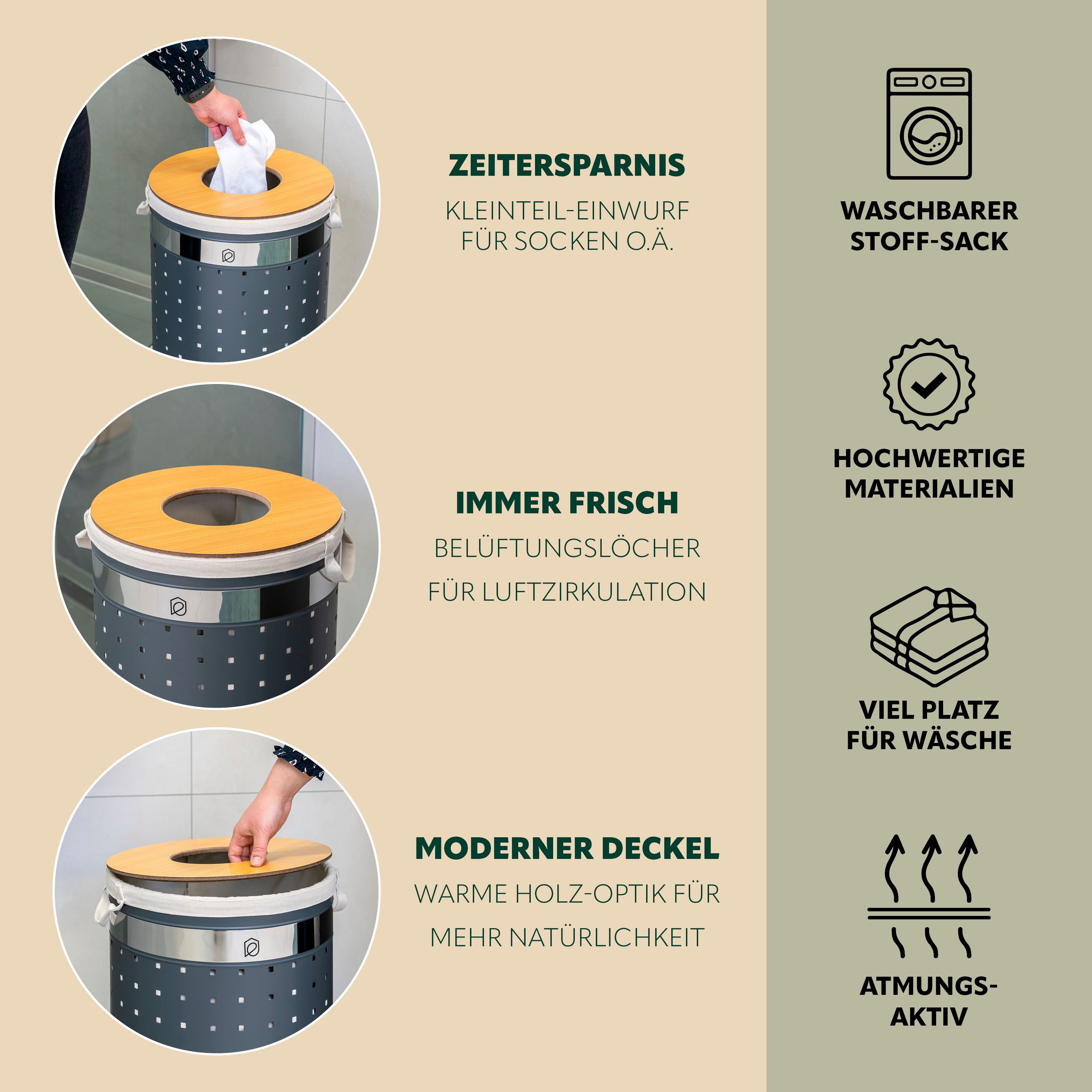 eluno Wäschetonne mit Deckel und Wäschesack rund 50L, aus Metall