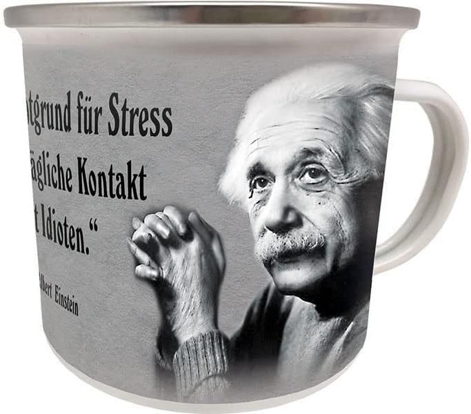 Emaille Becher 0,5 L - Hauptgrund für Stress - Idioten - Albert Einstein, EB 76