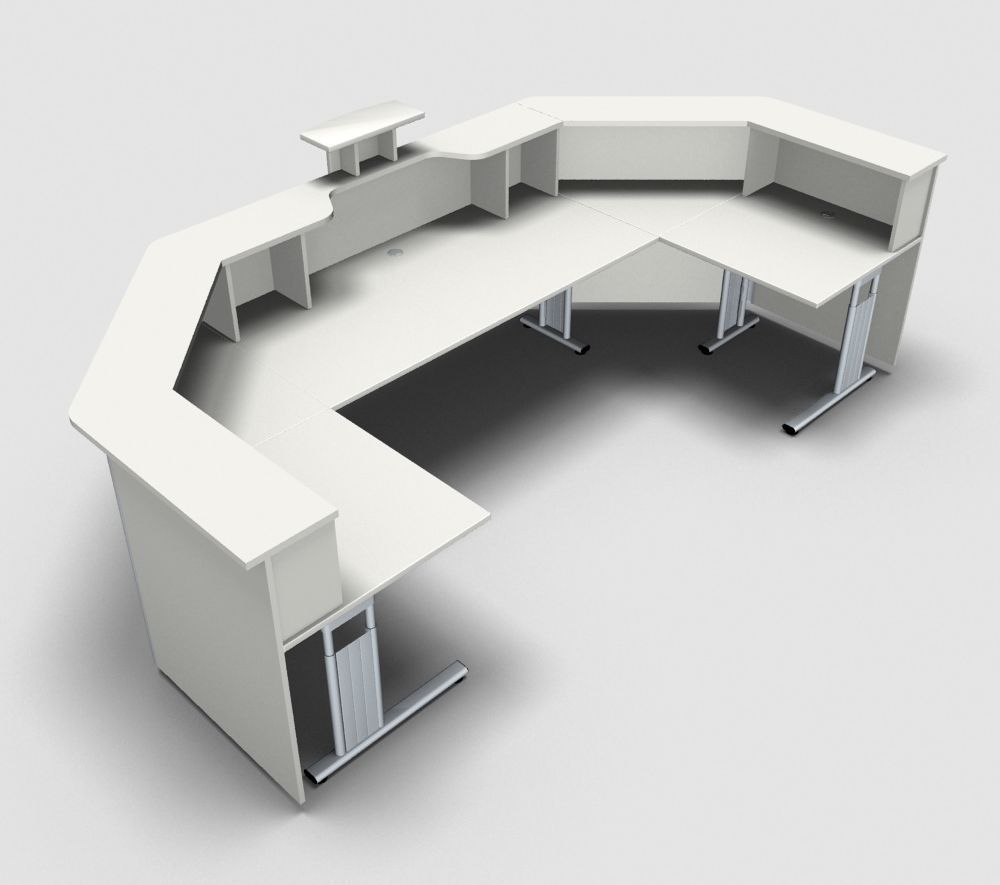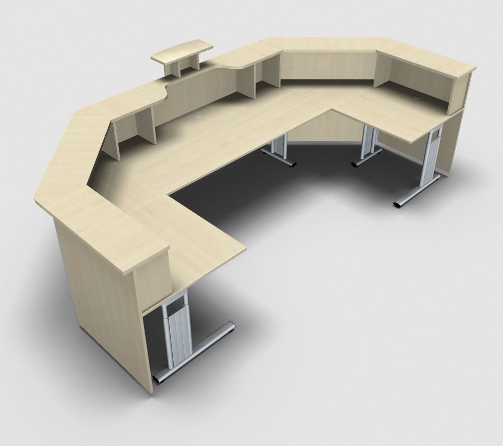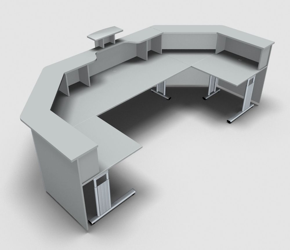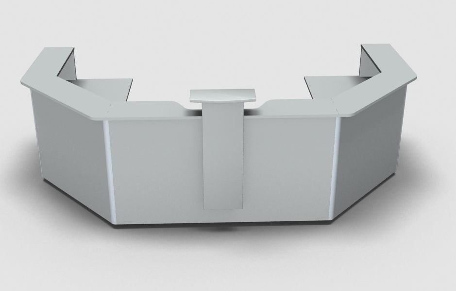 Hochwertige Empfangstheke Solid mit einer Stellfläche von 340 x 160 cm bestehend aus Schreibtischen, Thekenfronten mit einem Monitorausschnitt und einem Designaufsatz und Eckverbindungen. Dekorfarbe wählbar.