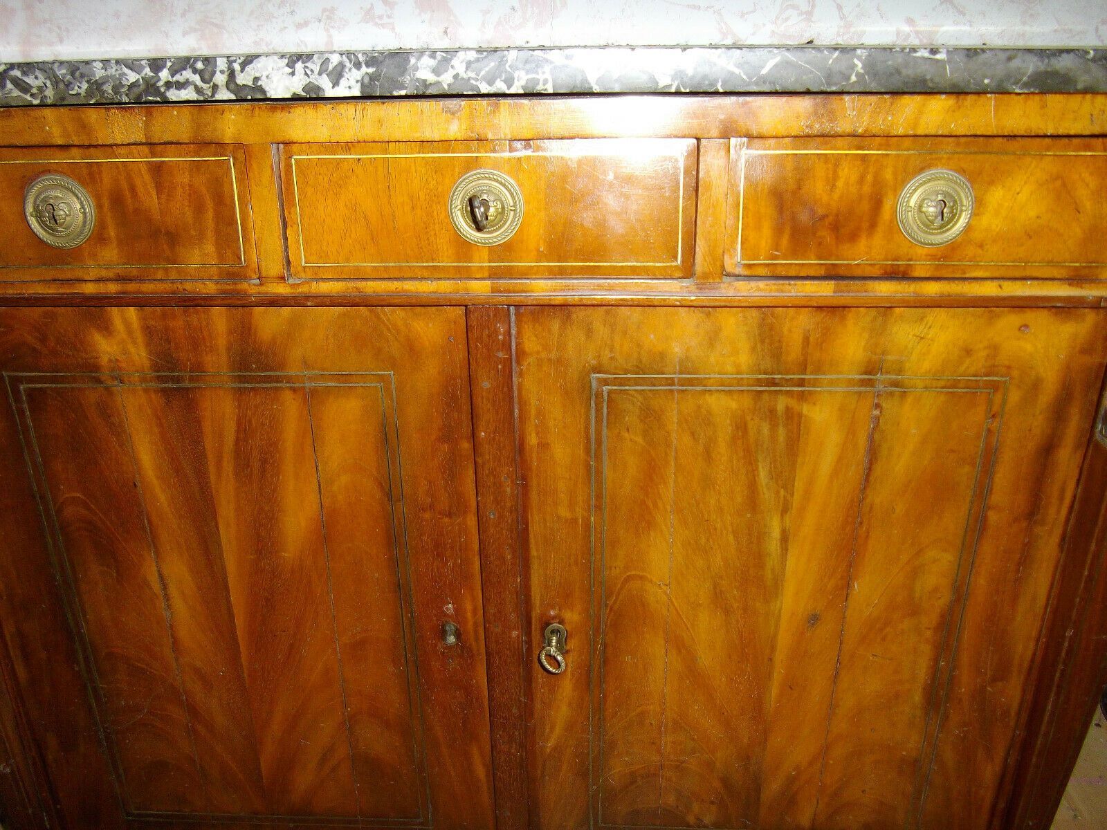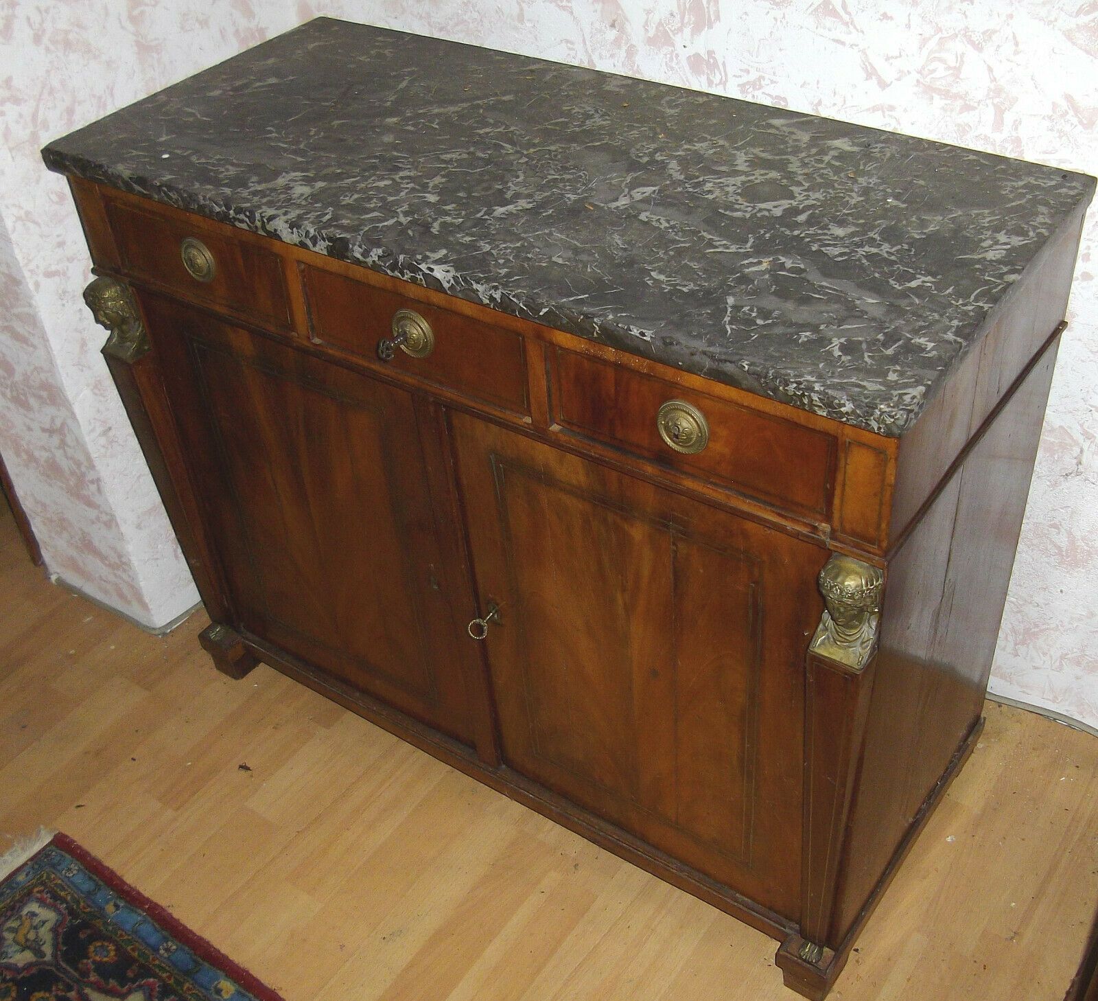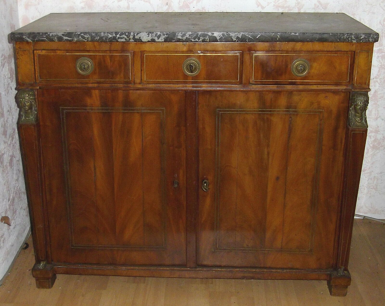 Empire-Kommode um 1790. Material: Mahagoni dunkel, Messingbeschläge und -intarsienbänder, grüne Marmorplatte Drei Schubladen, zwei Türen. Recht guter Zustand! Maße: H 80, B 92 cm, T 43 cm. Lieferung im Umkreis von 40 km frei Haus! Sonst Transport mit Spedition möglich (je nach Angebot und Entfernung