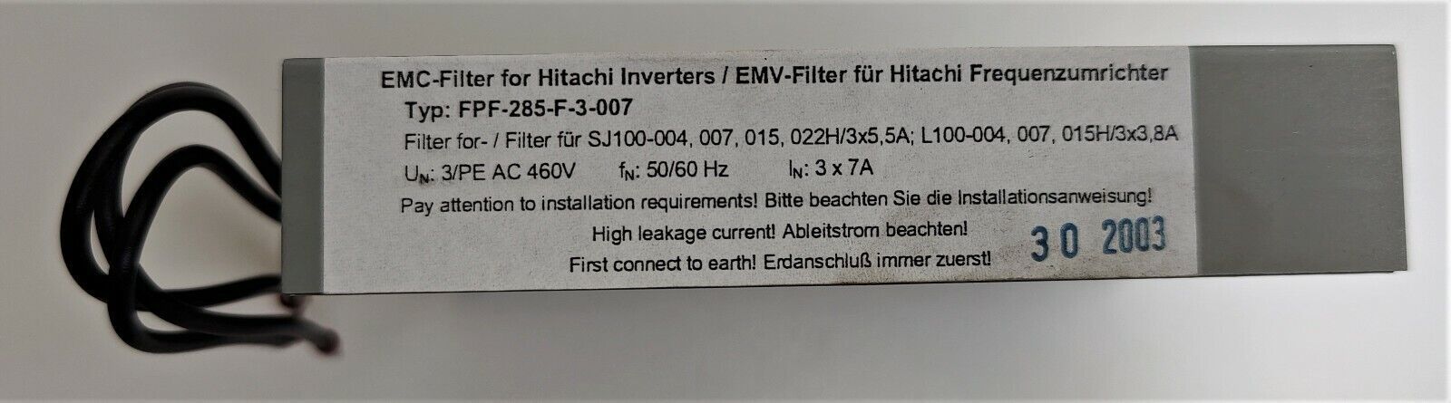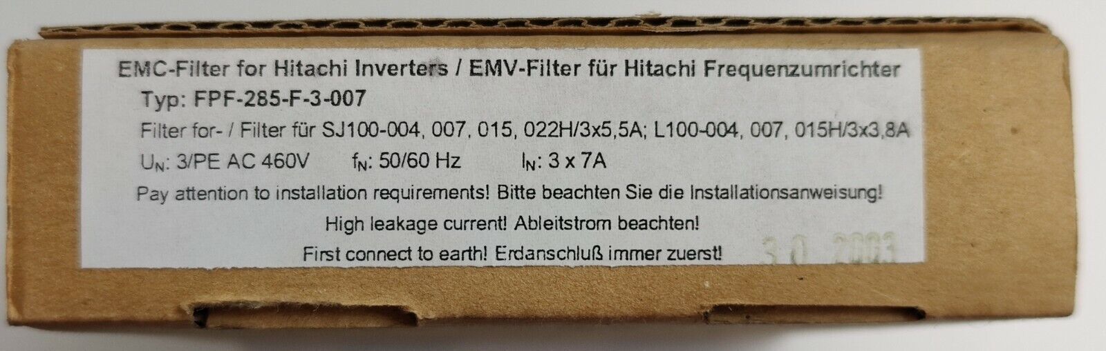 EMV-Filter für Hitachi Frequenzumrichter FPF-285-F-3-007 EMV-Filter für Hitachi Frequenzumrichter Typ: FPF-285-F-3-007 Filter für SJ100-004, 007, 015, 022H 3x5,5A; L100-004, 007, 015H 3x3,8A U N : 3 PE AC 460V f N : 50 60 Hz I N : 3 x 7A Für weitere Details siehe Bilder.