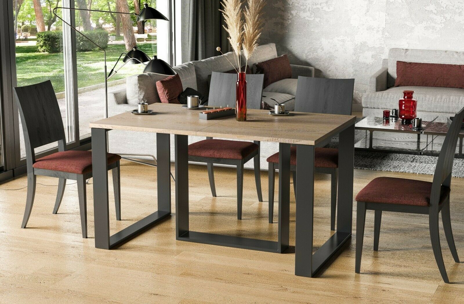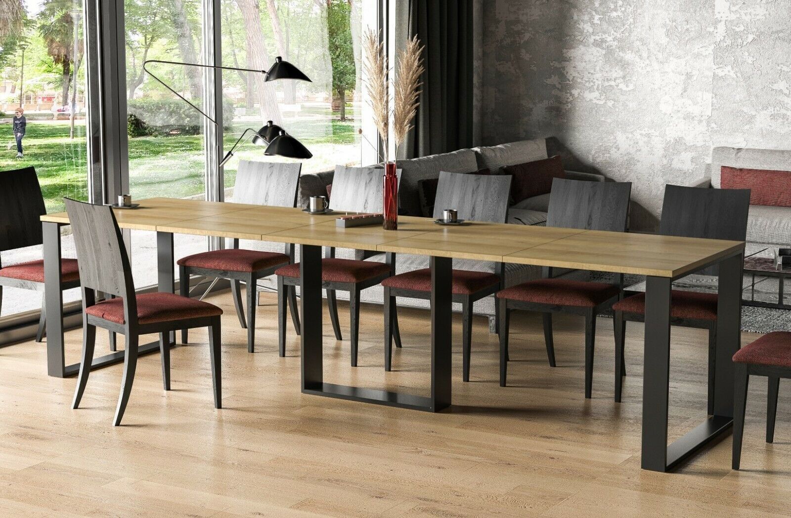 moderner Kufentisch 130-290 cm Material: MDF Gestell: Metall Maße: Breite: 130 -290 cm Länge: 80 cm Höhe: 76 cm Stabile und robuste Verarbeitung hochwertiges und langlebiges Nachbildungsfurnier Synchronauszug - mit vier Erweiterungsplatten je 40 cm Die Erweiterungsplatten können individuell eingeset