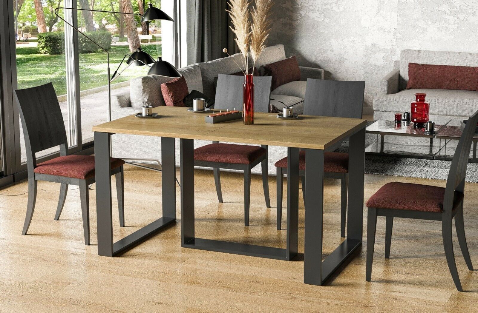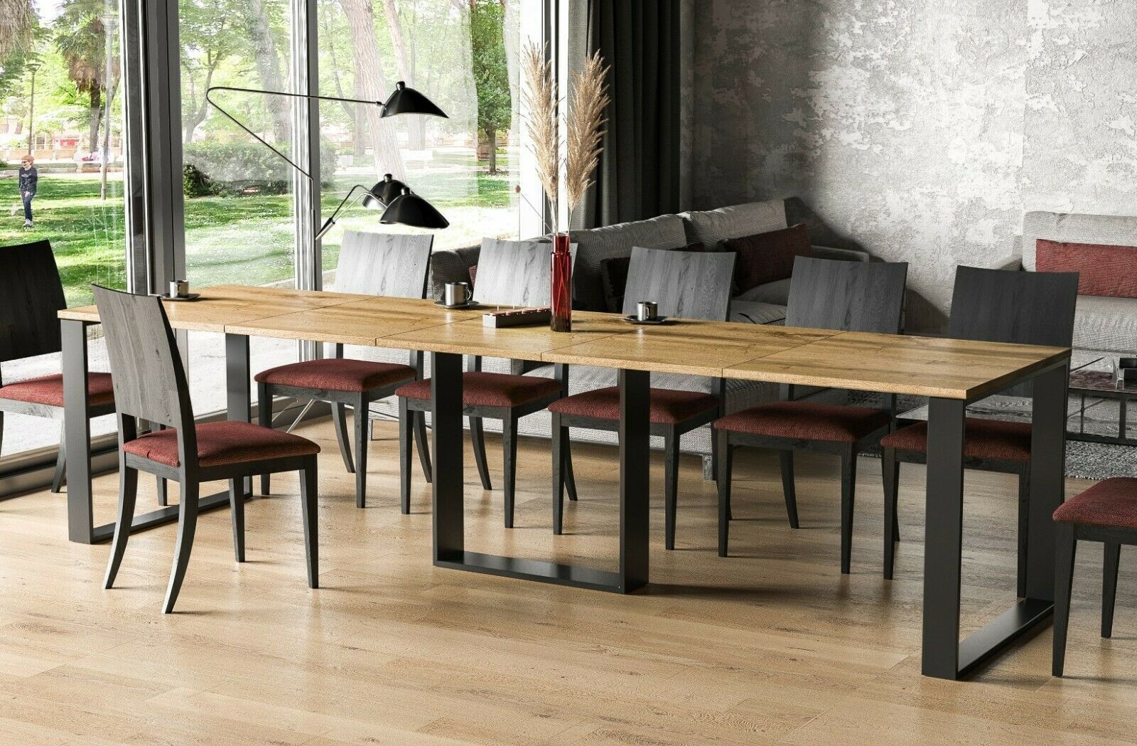 moderner Kufentisch 130-310 cm Material: MDF Gestell: Metall Maße: Breite: 130 -310 cm Länge: 90 cm Höhe: 76 cm Stabile und robuste Verarbeitung hochwertiges und langlebiges Nachbildungsfurnier Synchronauszug - mit drei Erweiterungsplatten je 60 cm Die Erweiterungsplatten können individuell eingeset