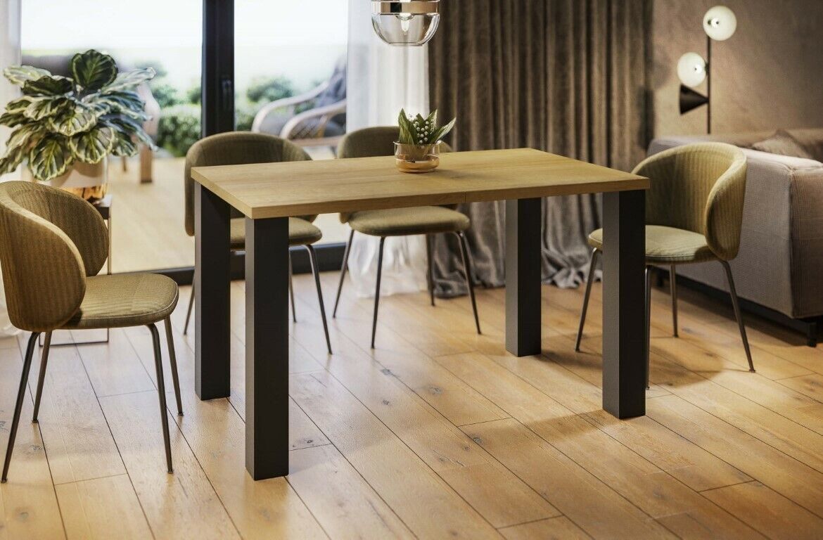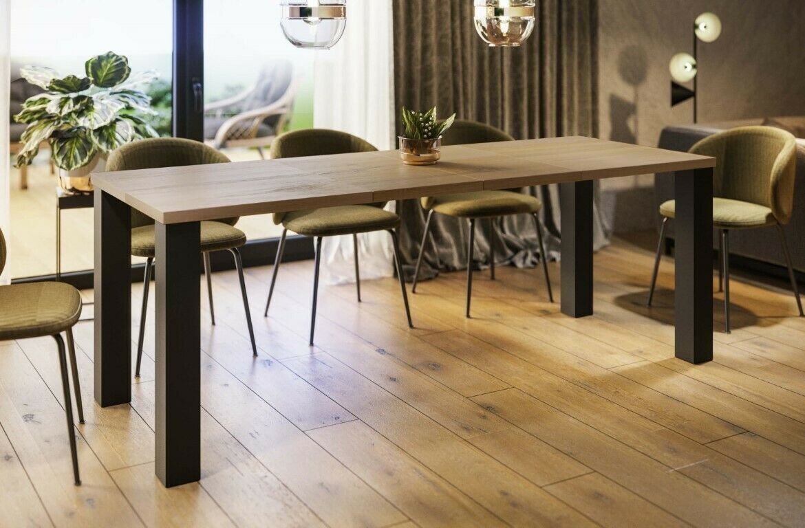 moderner Esstisch 130-175 cm Material: MDF Maße: Breite: 130-175 cm Länge: 80 cm Höhe: 76 cm Stabile und robuste Verarbeitung hochwertiges und langlebiges Nachbildungsfurnier Synchronauszug - mit einer Erweiterungsplatte 45 cm Tischplatte wird vormontiert geliefert Metallgestell schwarz pulverbeschi