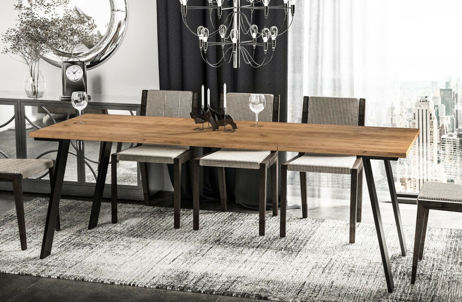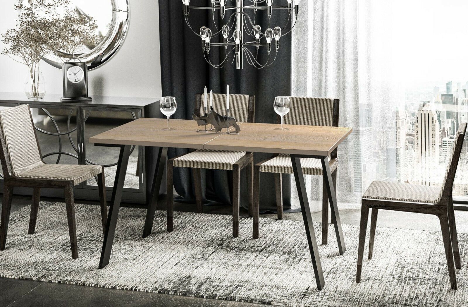 moderner Esstisch 130-210 cm Material: MDF Gestell: Metall Maße: Breite: 130 -210 cm Länge: 80 cm Höhe: 76 cm Stabile und robuste Verarbeitung hochwertiges und langlebiges Nachbildungsfurnier Synchronauszug - mit zwei Erweiterungsplatten a 40 cm Tischplatte wird vormontiert geliefert Metallgestell s