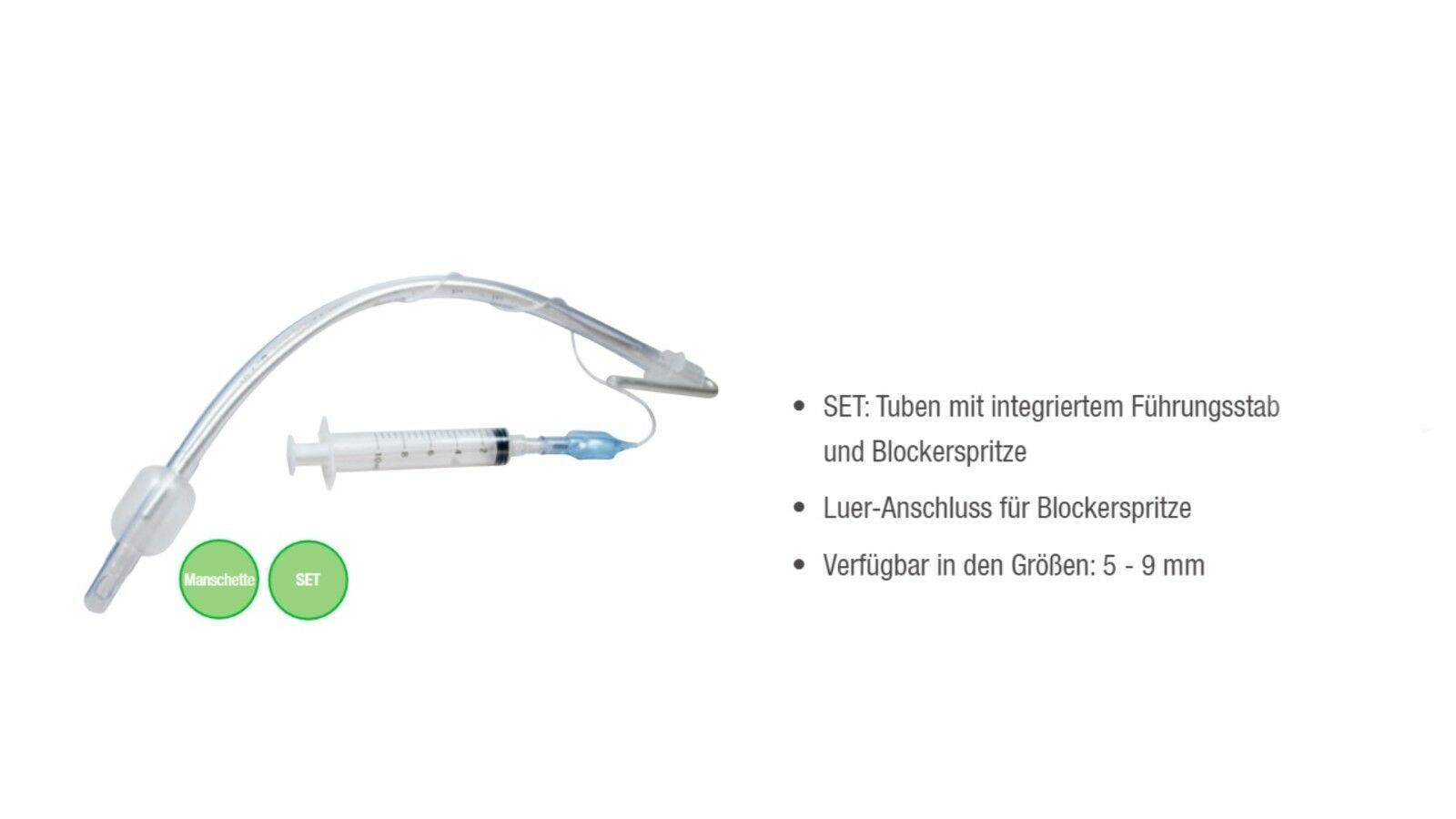 HUM Endotrachealtubus Notfall Set Tubus Blockerspritze & Führungstab Gr. 5-9 Magill