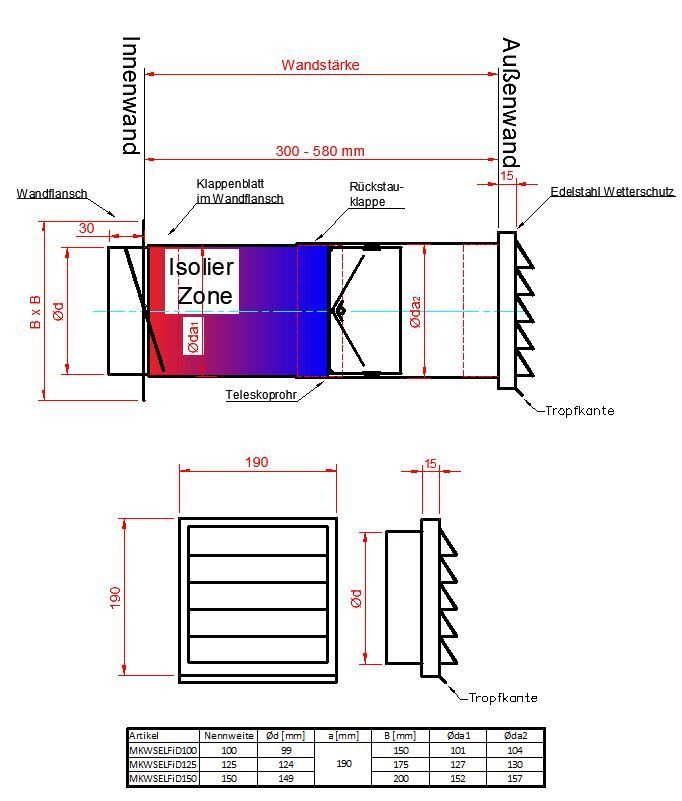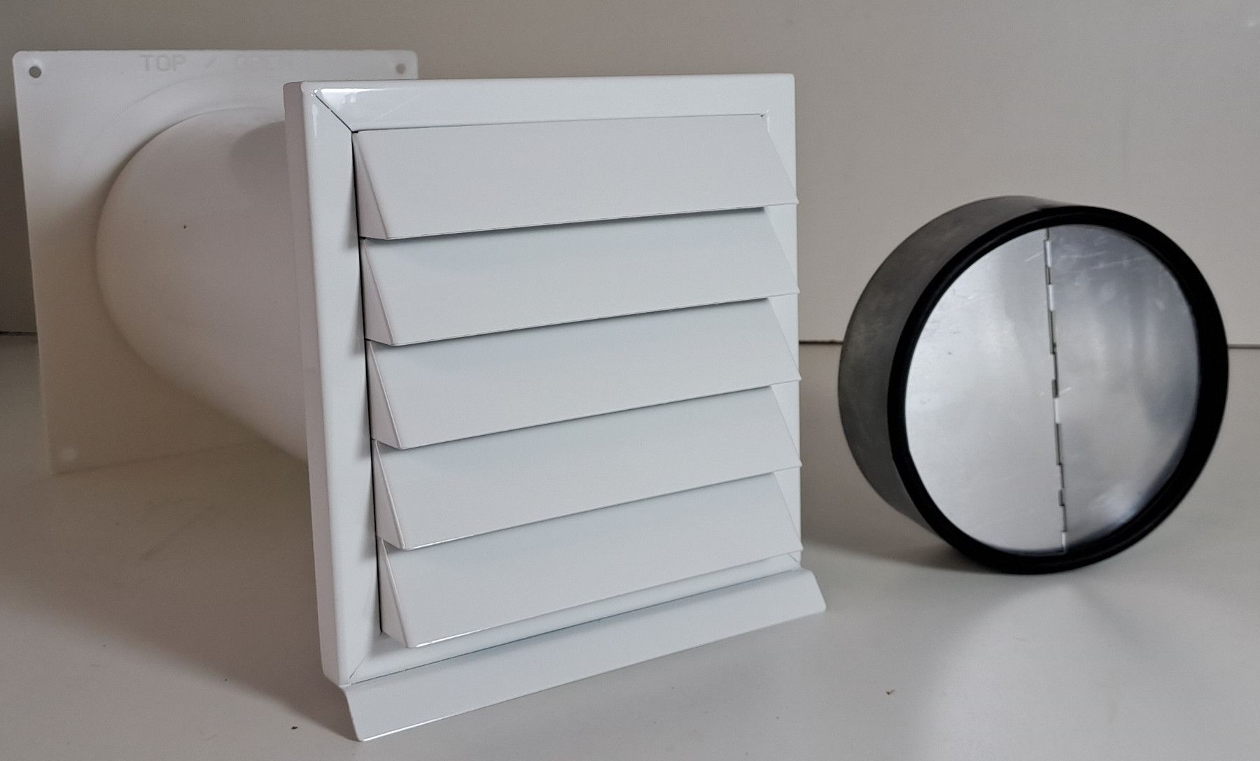 Energiespar Mauerkasten Ø150 mit zwei Rückstauklappen, anschraubbar! Mkwselfid Weiß