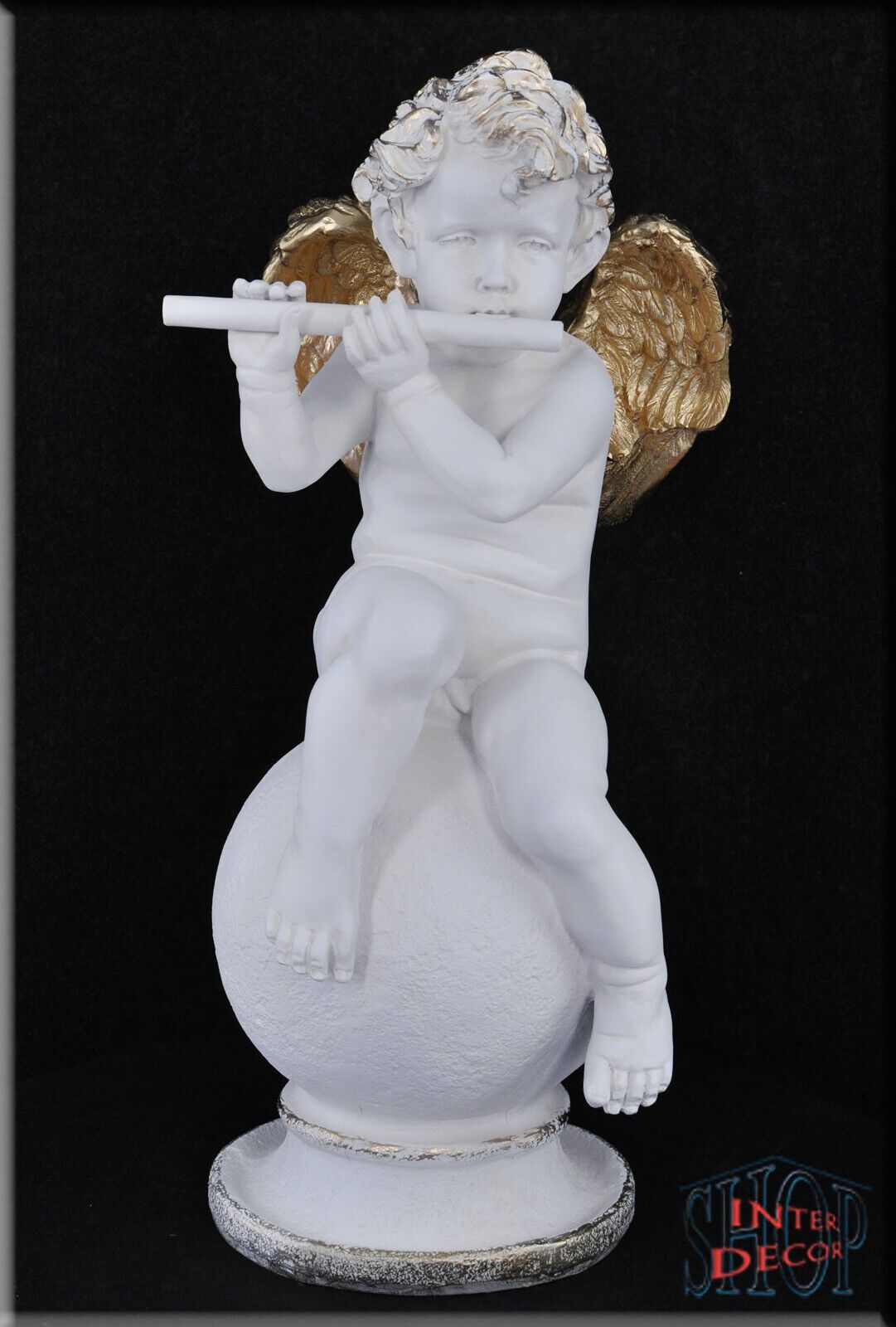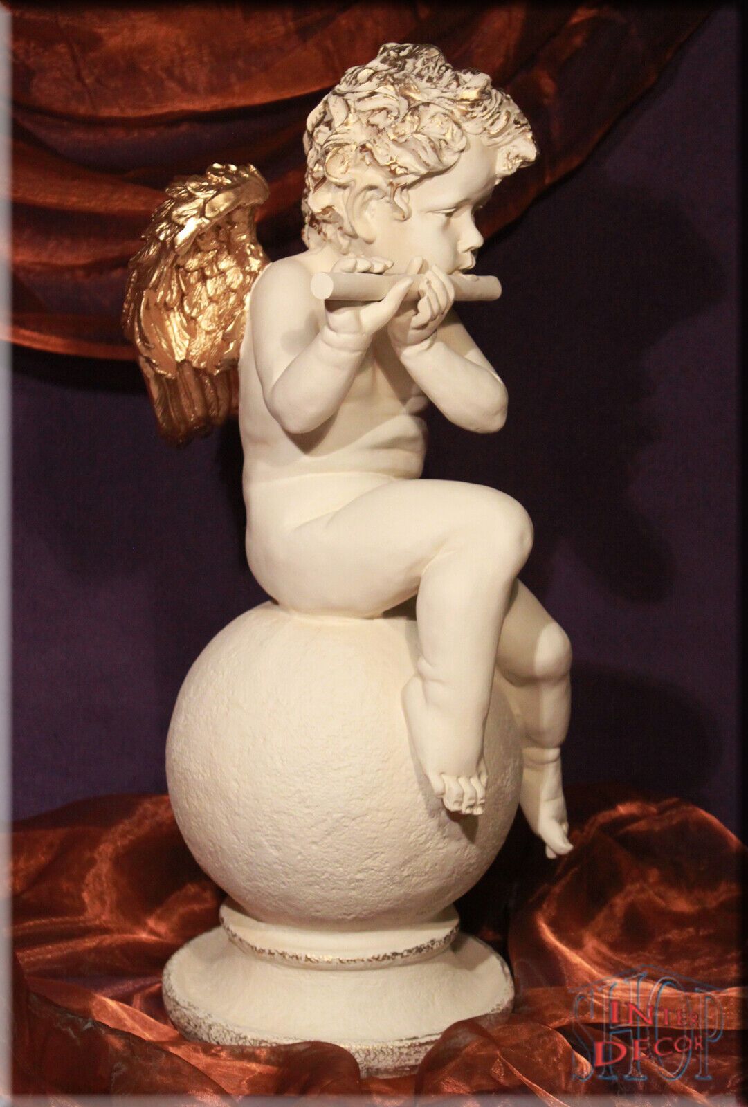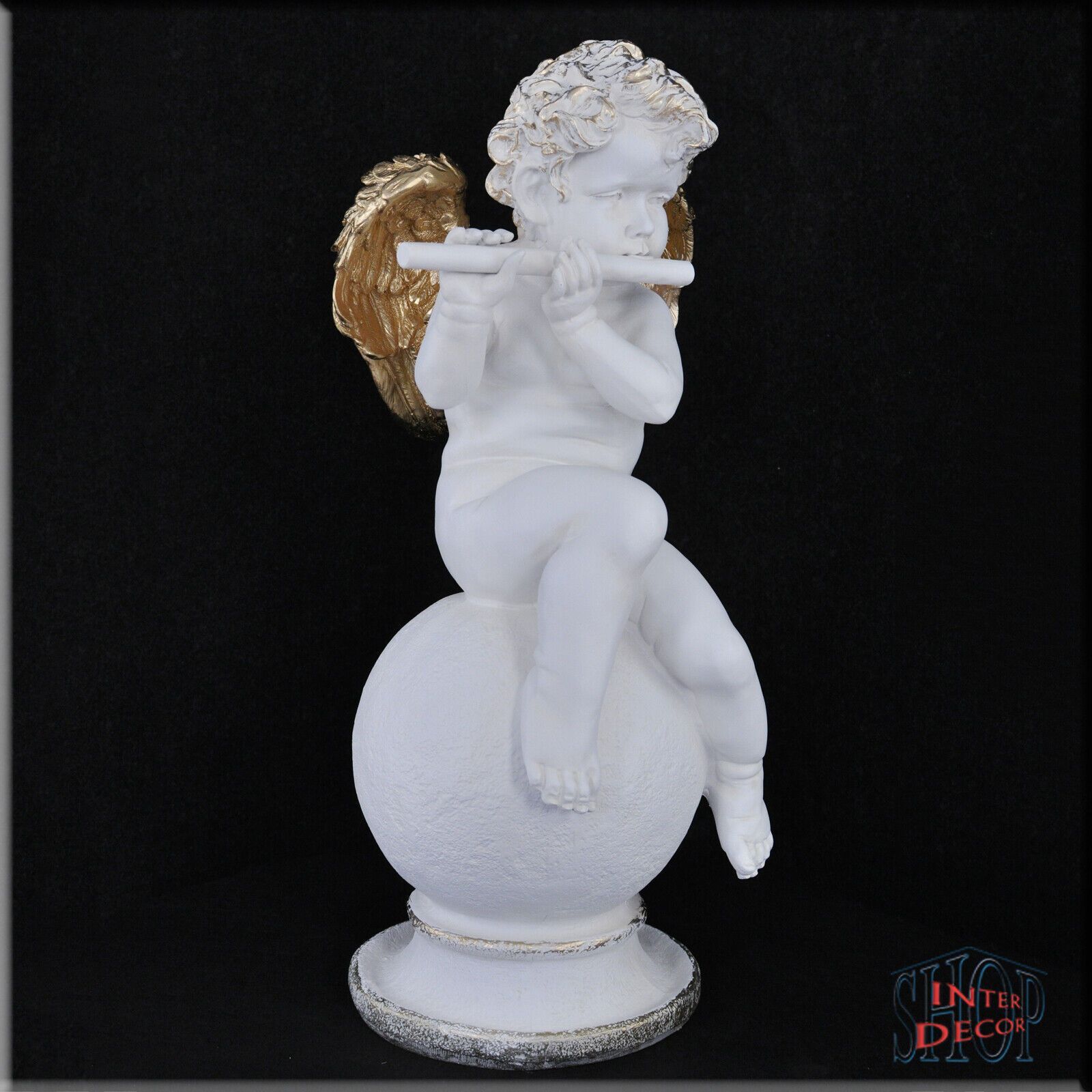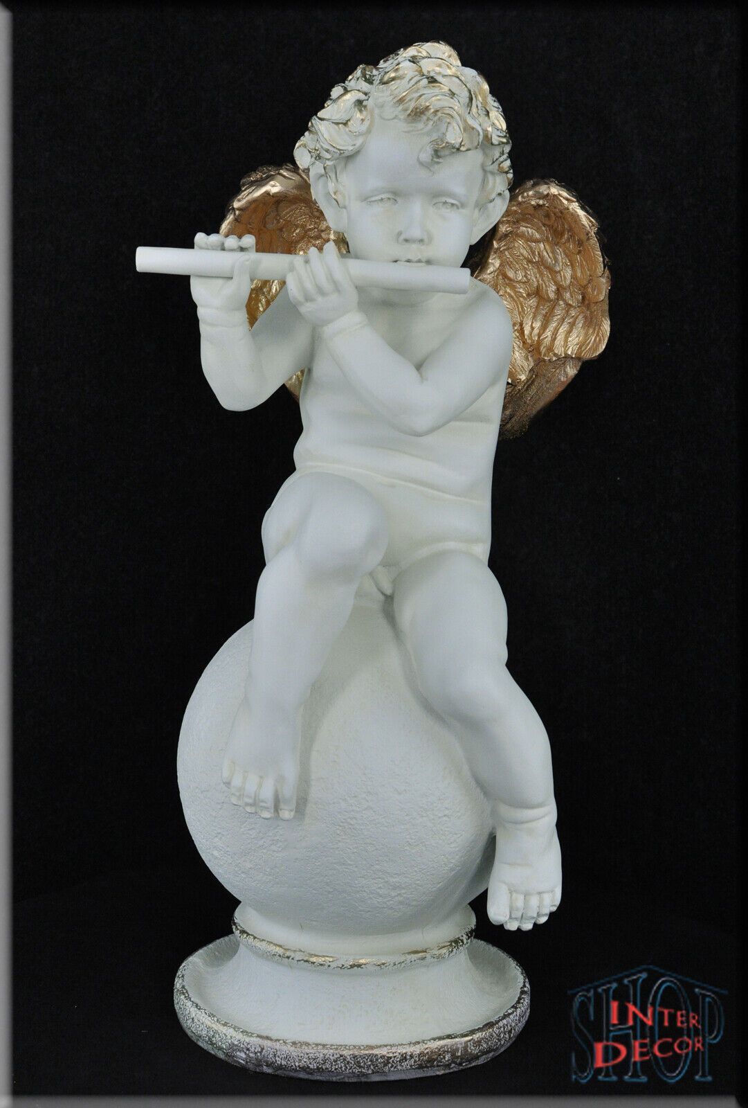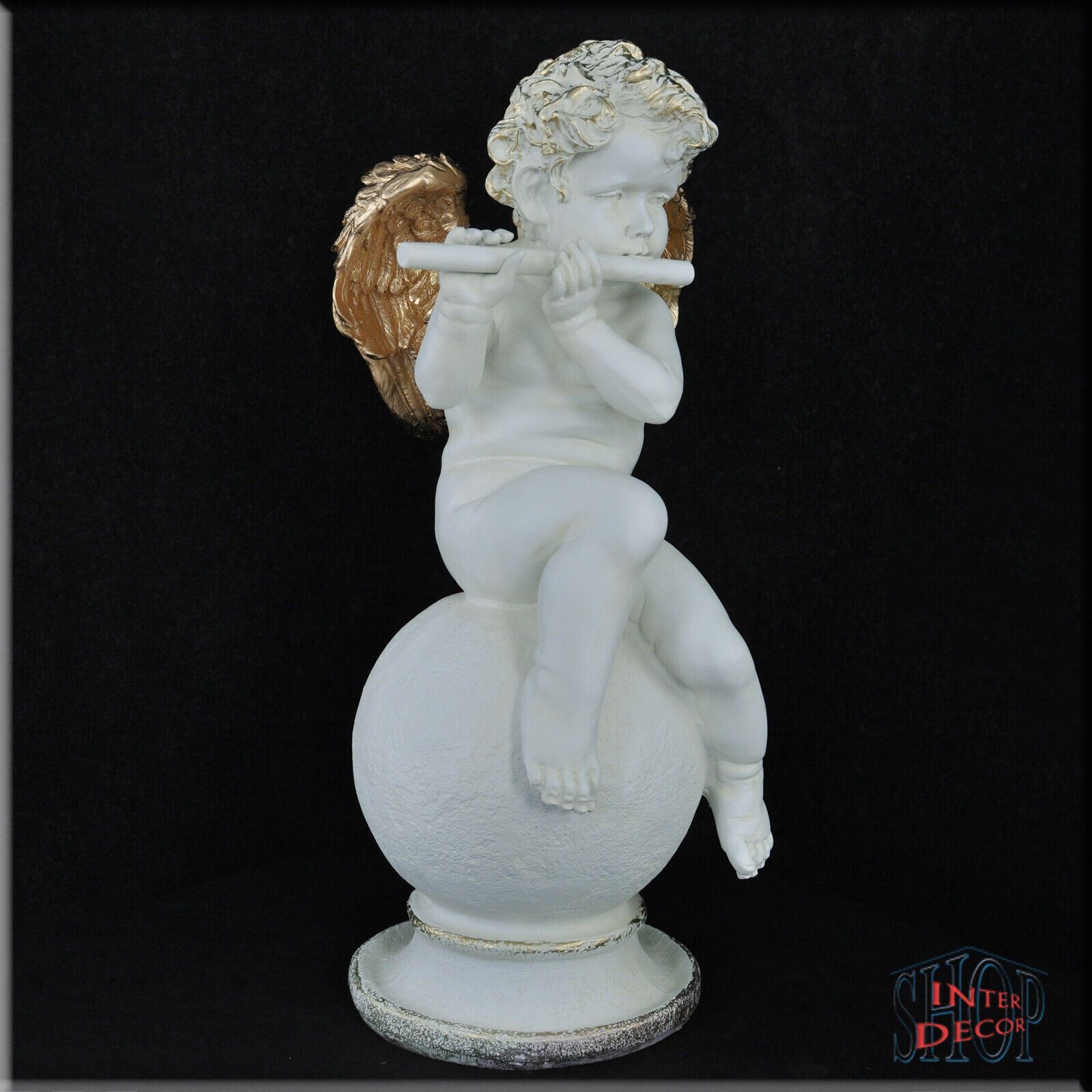 Engel auf Kugel mit Flöte Liebesengel Amor Figur Gartenfigur Skulptur Kunstharz