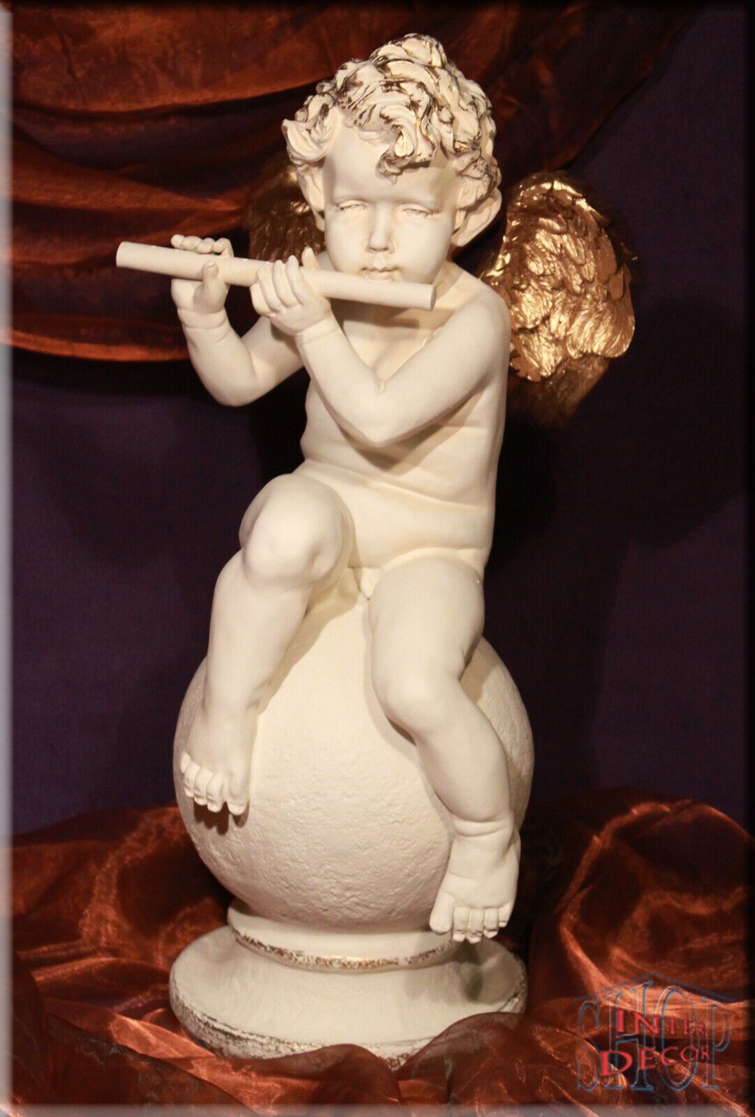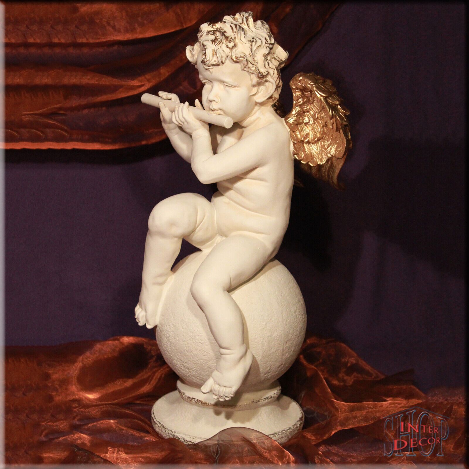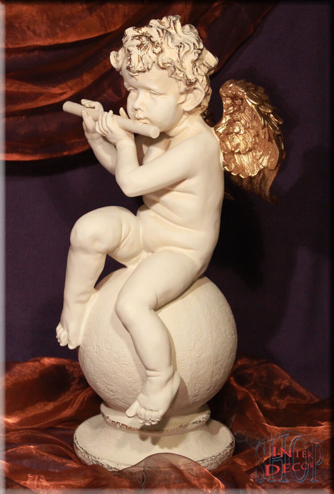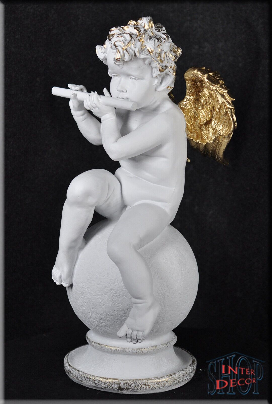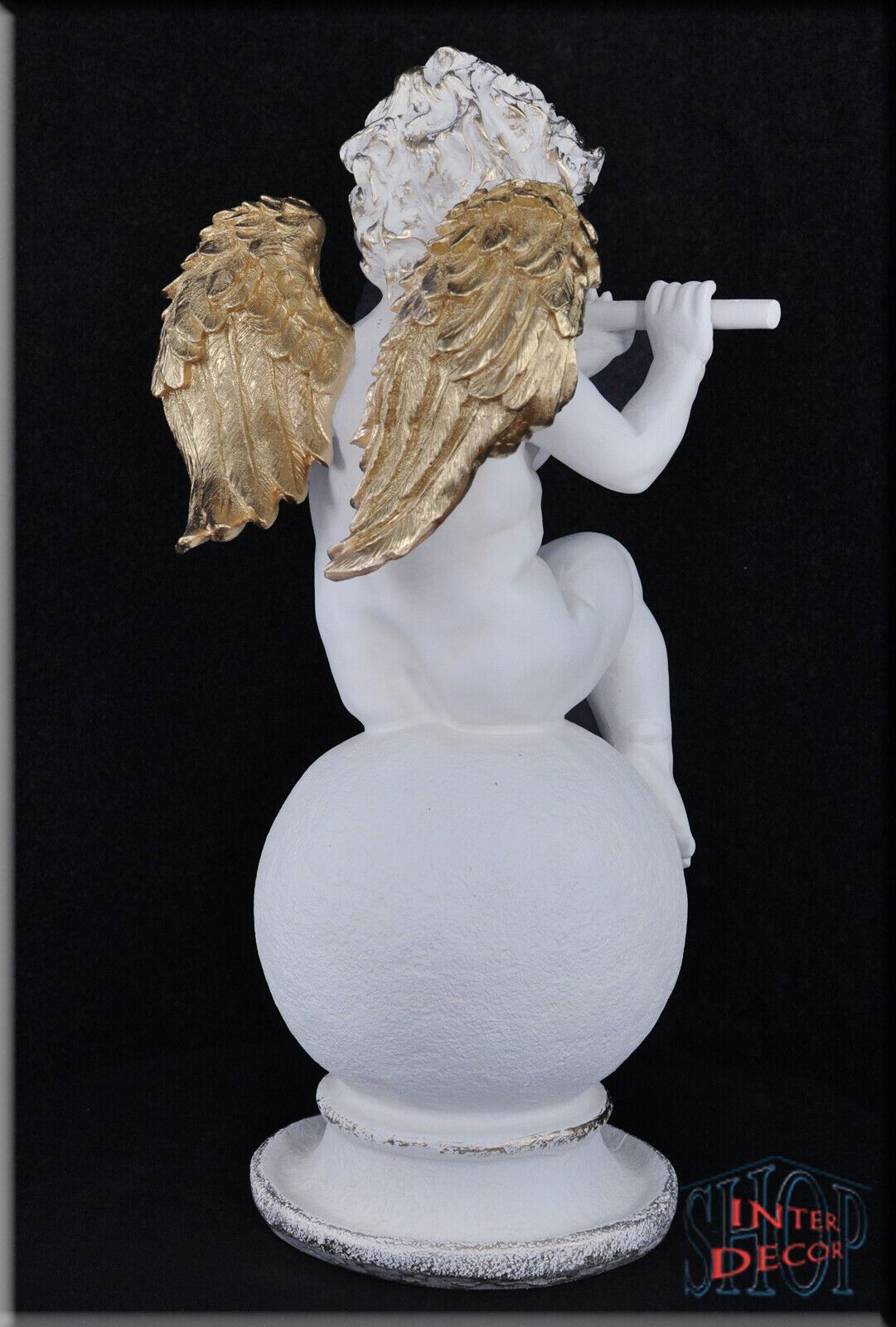 Engel auf Kugel mit Flöte Liebesengel Amor Figur Gartenfigur Skulptur Kunstharz