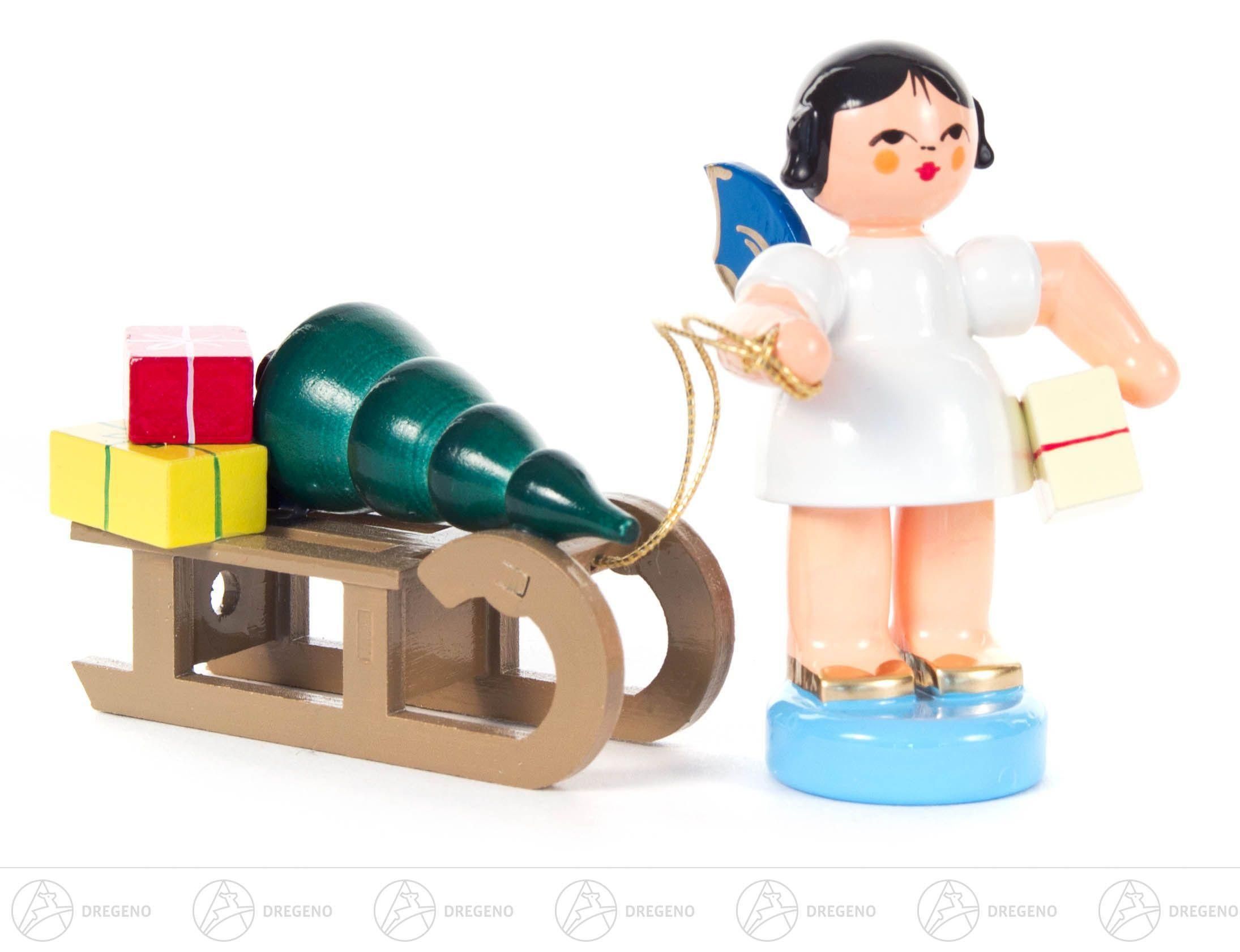 Engel mit Geschenkeschlitten stehend, blaue Flügel Höhe = 60mm NEU Holzengel