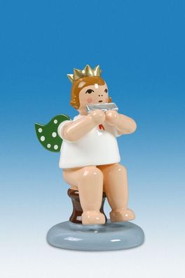 • Holzfigur Engel sitzend mit Mundharmonika und Krone Höhe 6cm NEU Holzengel Instru