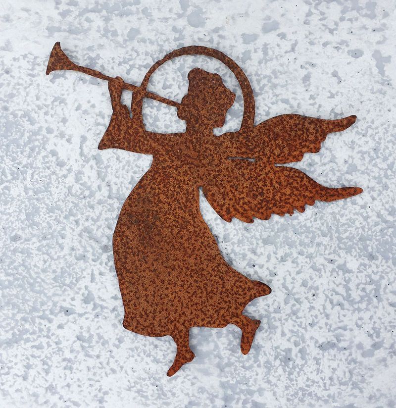 ENGEL MIT POSAUNE Baumschmuck Edelrost Dieser Engel ist eine schöne Dekoration für Haus und Garten. Er ist zum Hängen geeignet. Jedes Stück ist in Handarbeit gefertigt und somit ein Unikat, deshalb kann auch die wunderschöne Edelrostpatina variieren Sehr hochwertig verarbeitet. Leichte Abweichungen