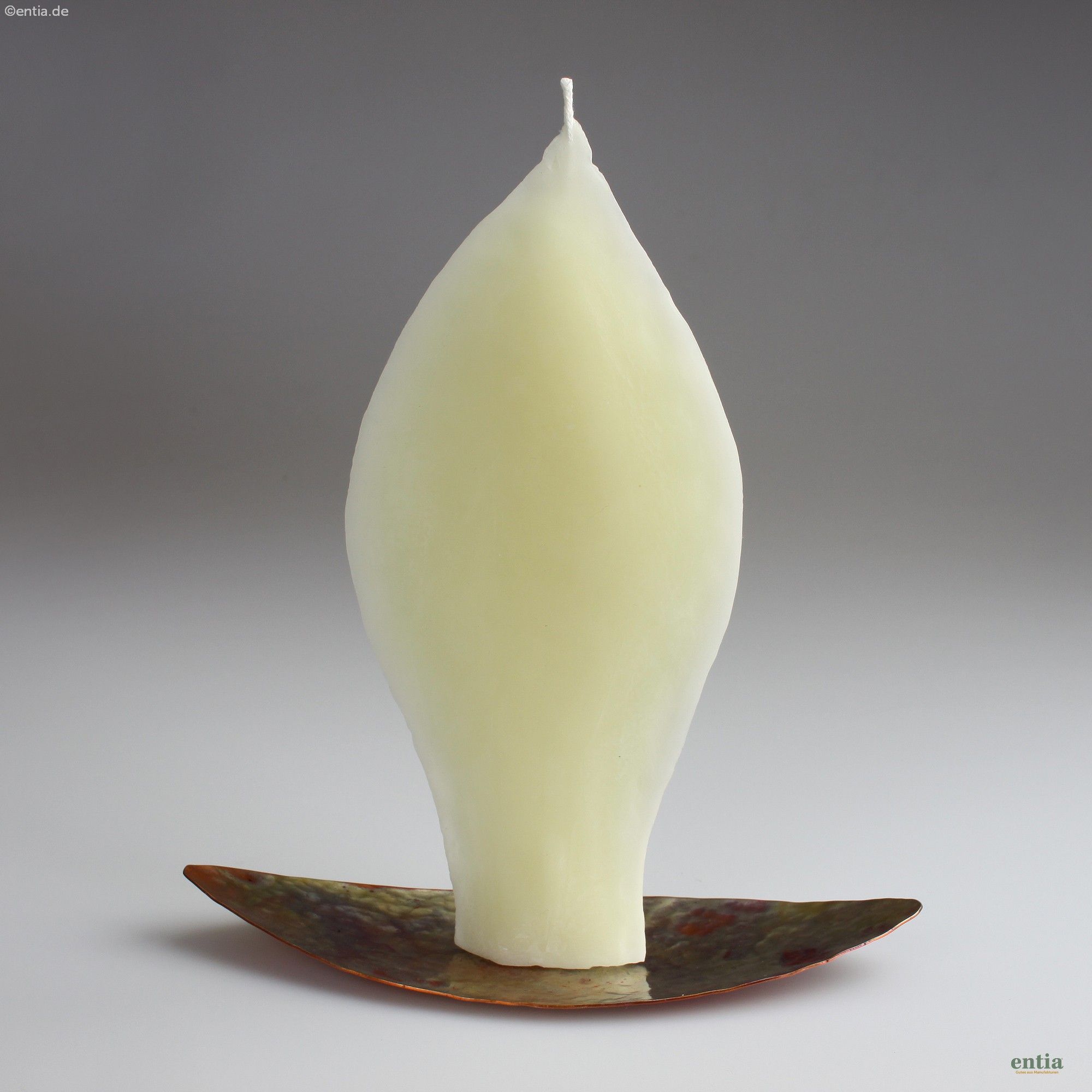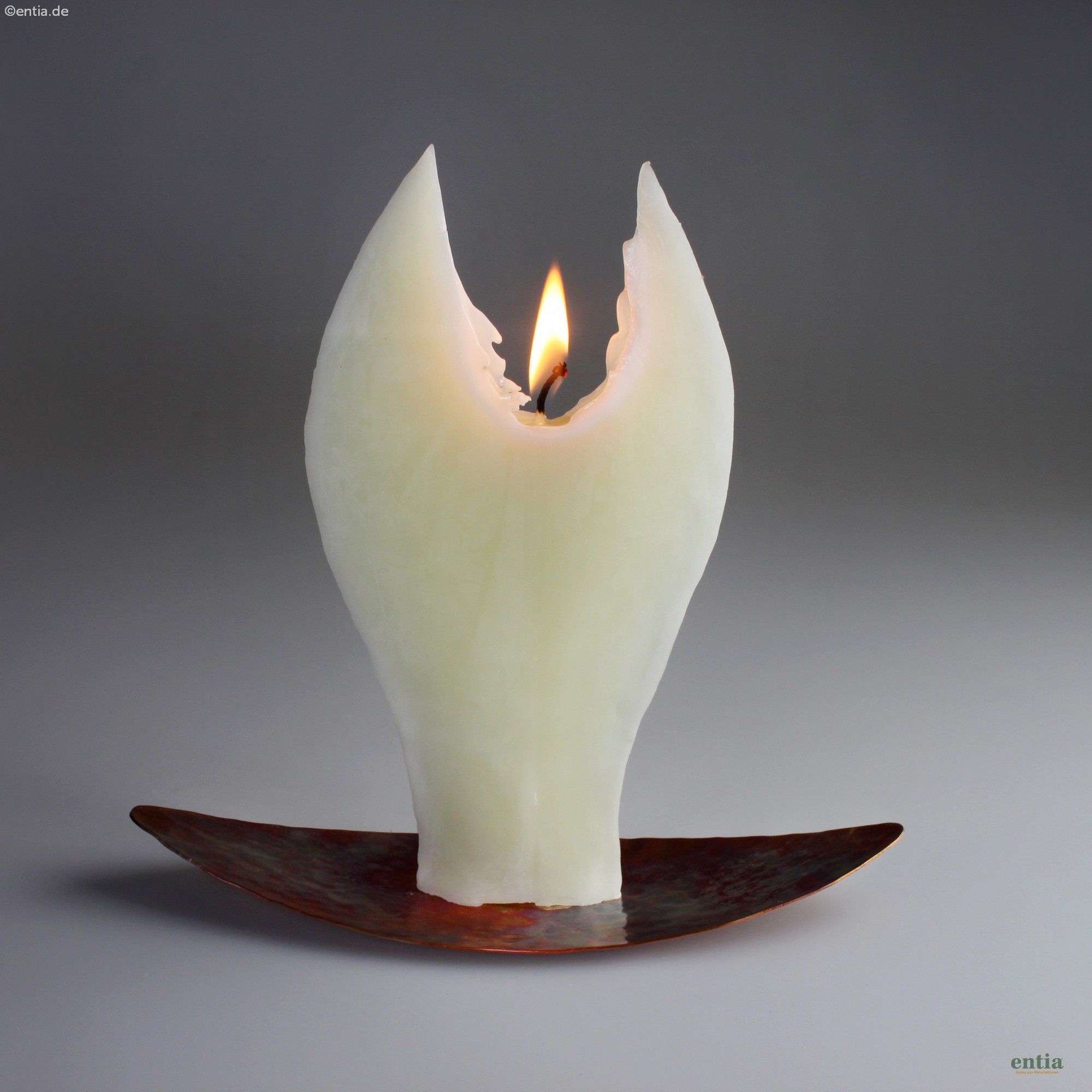 Diese handgefertigte Engelkerze aus gebleichtem Bienenwachs offenbart beim Abbrennen ihre feine Flügelform. Ergänzt wird das Set durch einen handgetriebenen Kupferhalter aus einer Werkstatt für Menschen mit Behinderung.