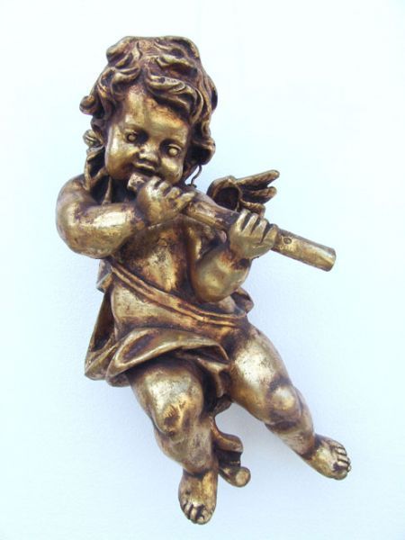 Engelputte hängend mit Flöte gold verkleinert 56cm für draußen aus Polyresin